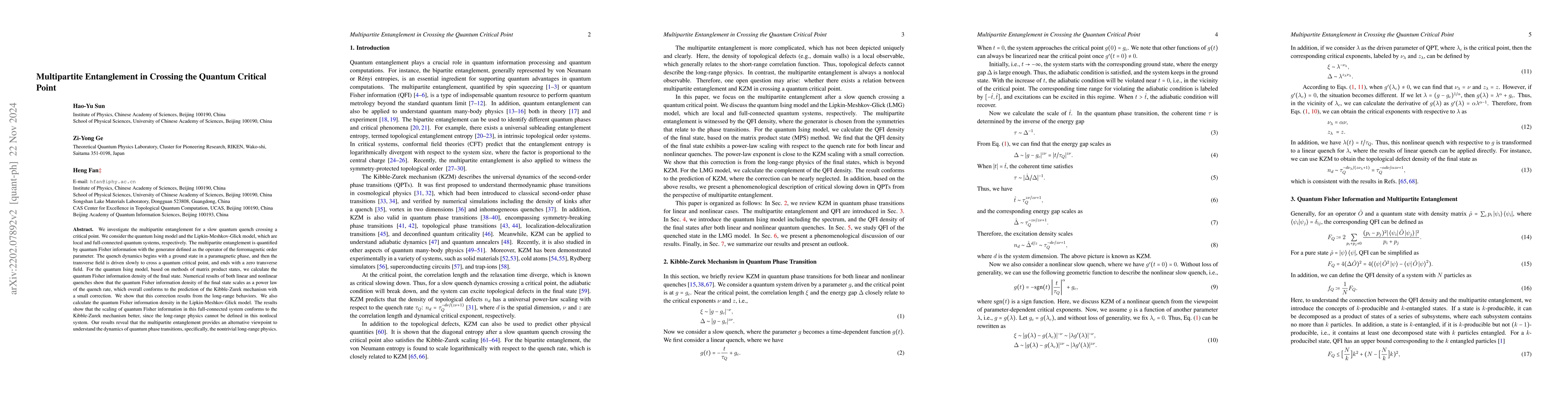 This paper explores the multipartite entanglement in the quantum Ising model across a critical point via slow quantum quenches, quantifying it using quantum Fisher information. The study reveals that the entanglement scales inversely to the Kibble-Zurek scaling, offering new insights into quantum phase transitions and potential applications in quantum information processing.