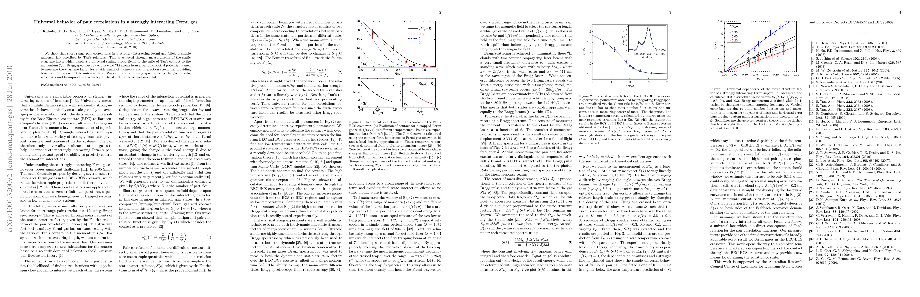 This paper demonstrates that short-range pair correlations in a strongly interacting Fermi gas adhere to a universal law described by Tan's relations, confirmed through measurements of the static structure factor. The study utilizes Bragg spectroscopy of ultracold $^6$Li atoms to measure the structure factor across various momenta and interaction strengths.