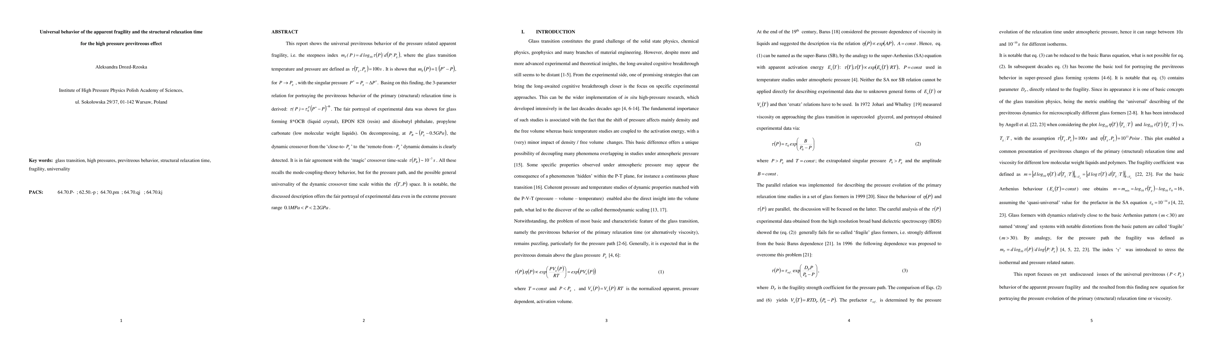 This report shows the universal previtreous behavior of the pressure related apparent fragility, i.e. the steepness index Basing on this finding, the 3-parameter relation for portraying the previtreous behavior of the primary (structural) relaxation time is derived. The fair portrayal of experimental data was shown for glass forming 8*OCB (liquid crystal), EPON 828 (resin) and diisobutyl phthalate, propylene carbonate (low molecular weight liquids). On decompressing, the dynamic crossover dynamic domains is clearly detected. All these recalls the mode-coupling-theory behavior, but for the pressure path. It is notable, the discussed description offers the fair portrayal of experimental data even in the extreme pressure range P up to 2.2 GPa.