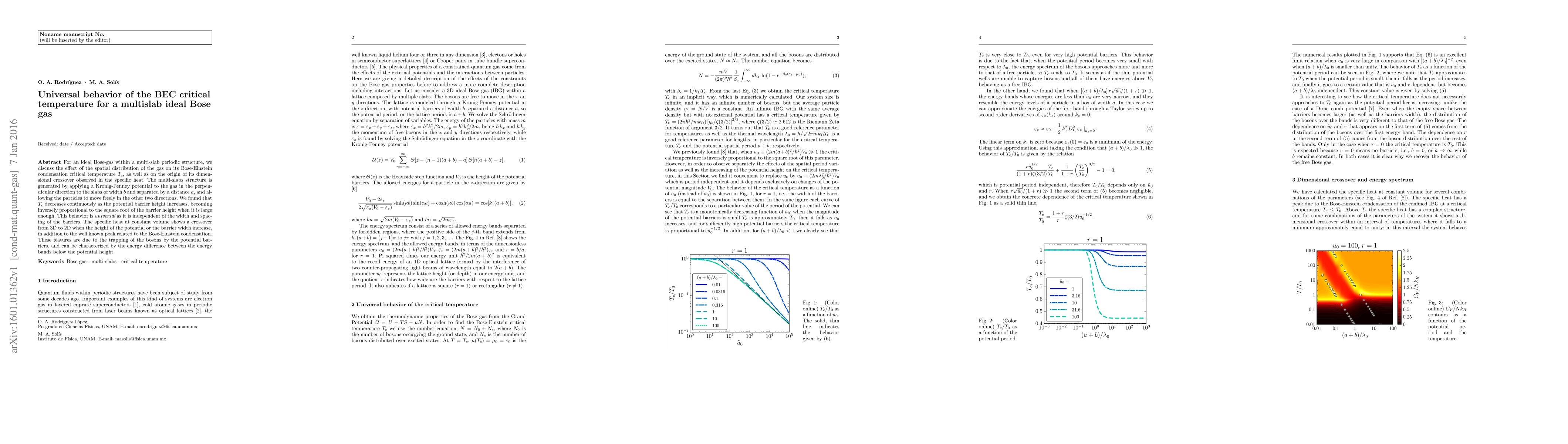 For an ideal Bose-gas within a multi-slab periodic structure, we discuss the effect of the spatial distribution of the gas on its Bose-Einstein condensation critical temperature $T_c$, as well as on the origin of its dimensional crossover observed in the specific heat. The multi-slabs structure is generated by applying a Kronig-Penney potential to the gas in the perpendicular direction to the slabs of width $b$ and separated by a distance $a$, and allowing the particles to move freely in the other two directions. We found that $T_c$ decreases continuously as the potential barrier height increases, becoming inversely proportional to the square root of the barrier height when it is large enough. This behavior is {\it universal} as it is independent of the width and spacing of the barriers. The specific heat at constant volume shows a crossover from 3D to 2D when the height of the potential or the barrier width increase, in addition to the well known peak related to the Bose-Einstein condensation. These features are due to the trapping of the bosons by the potential barriers, and can be characterized by the energy difference between the energy bands below the potential height.