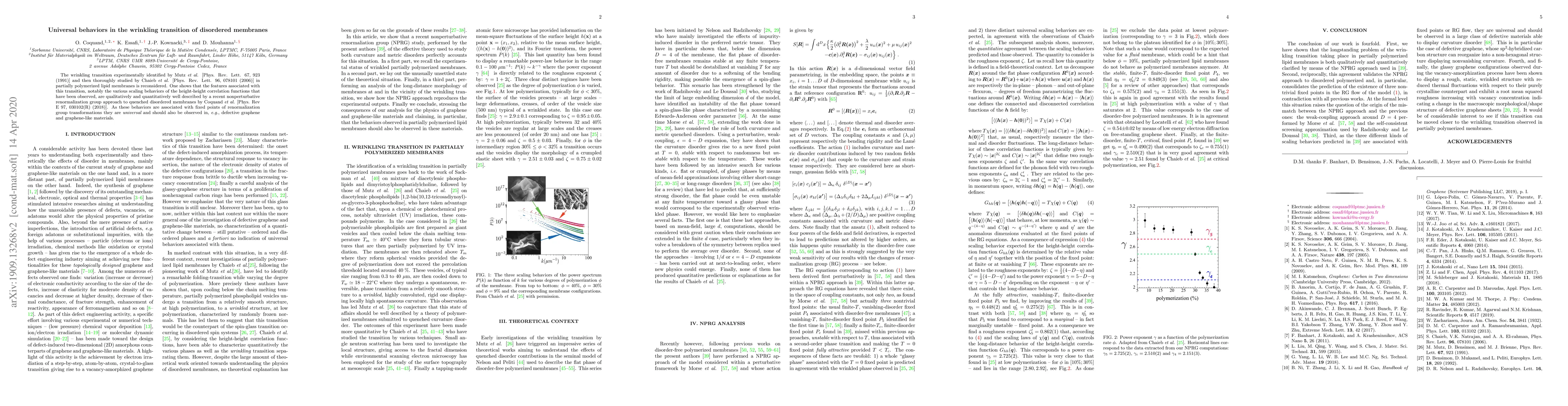 The wrinkling transition experimentally identified by Mutz et al. [Phys. Rev. Lett. 67, 923 (1991)] and then thoroughly studied by Chaieb et al. [Phys. Rev. Lett. 96, 078101 (2006)] in partially polymerized lipid membranes is reconsidered. One shows that the features associated with this transition, notably the various scaling behaviors of the height-height correlation functions that have been observed, are qualitatively and quantitatively well described by a recent nonperturbative renormalization group (NPRG) approach to quenched disordered membranes by Coquand et al. [Phys. Rev E 97, 030102 (2018)]. As these behaviors are associated with fixed points of RG transformations they are universal and should also be observed in, e.g., defective graphene and graphene-like materials.