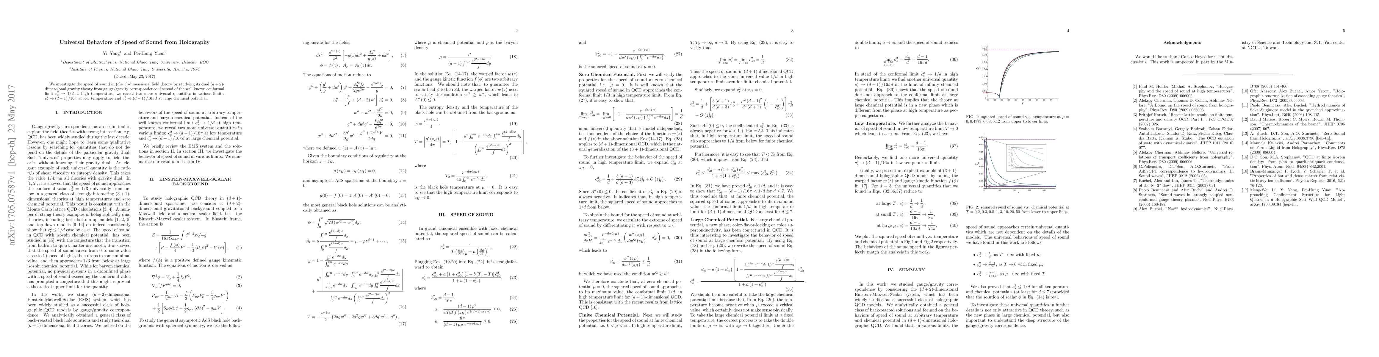 Researchers discovered two universal speed of sound behaviors in relation to temperature and chemical potential, adding new insights to field theory through gauge/gravity correspondence.