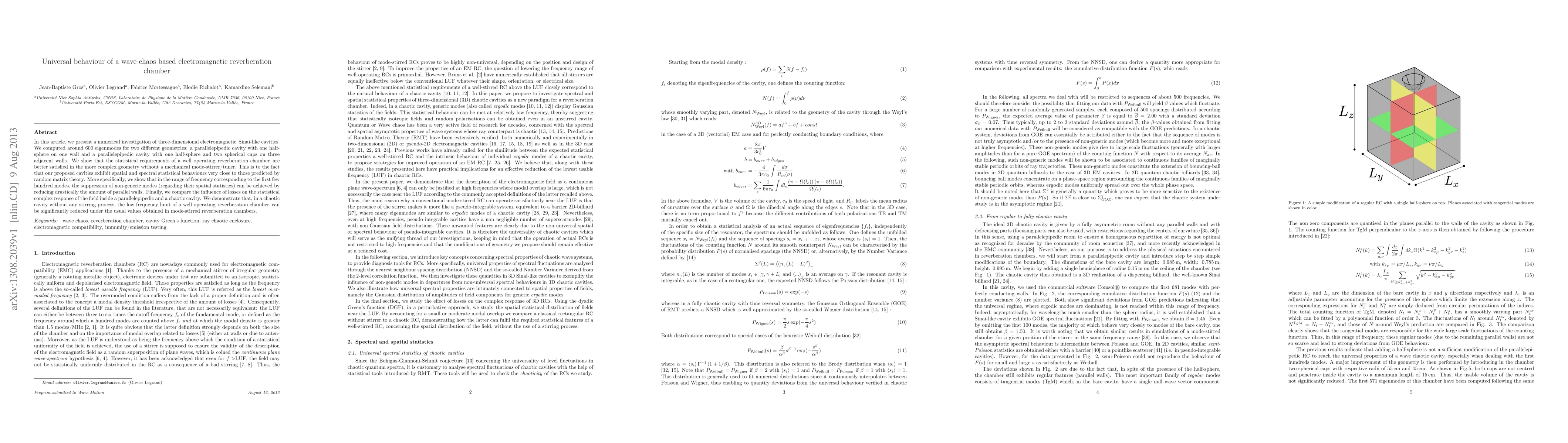 In this article, we present a numerical investigation of three-dimensional electromagnetic Sinai-like cavities. We computed around 600 eigenmodes for two different geometries: a parallelepipedic cavity with one half- sphere on one wall and a parallelepipedic cavity with one half-sphere and two spherical caps on three adjacent walls. We show that the statistical requirements of a well operating reverberation chamber are better satisfied in the more complex geometry without a mechanical mode-stirrer/tuner. This is to the fact that our proposed cavities exhibit spatial and spectral statistical behaviours very close to those predicted by random matrix theory. More specifically, we show that in the range of frequency corresponding to the first few hundred modes, the suppression of non-generic modes (regarding their spatial statistics) can be achieved by reducing drastically the amount of parallel walls. Finally, we compare the influence of losses on the statistical complex response of the field inside a parallelepipedic and a chaotic cavity. We demonstrate that, in a chaotic cavity without any stirring process, the low frequency limit of a well operating reverberation chamber can be significantly reduced under the usual values obtained in mode-stirred reverberation chambers.