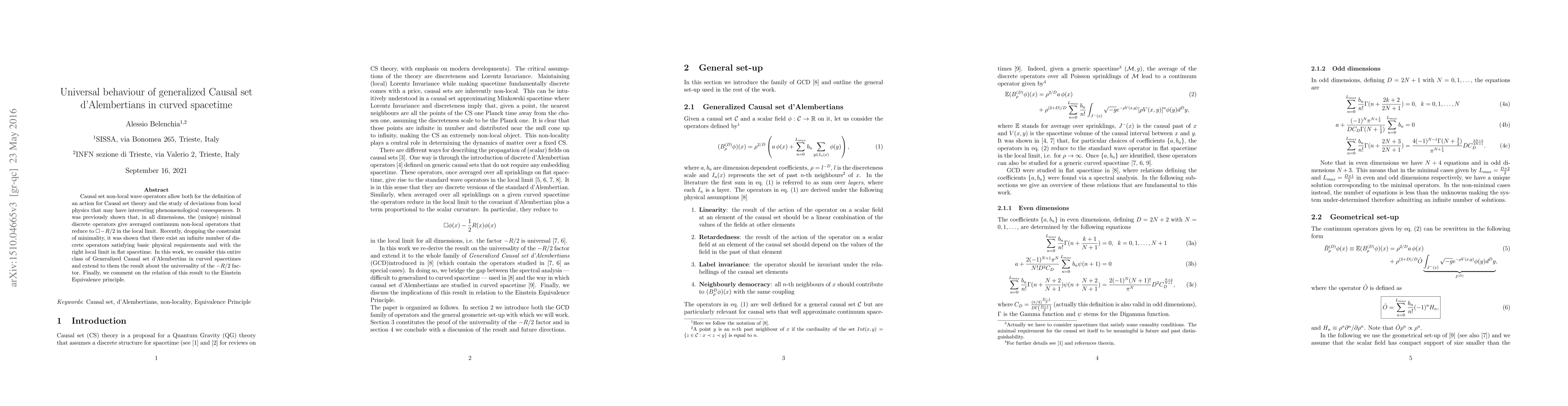 This paper explores generalized Causal set d'Alembertians in curved spacetime, demonstrating the universality of the $-R/2$ factor for an infinite class of non-local operators beyond the minimal discrete operators. It also discusses the implications for the Einstein Equivalence Principle.