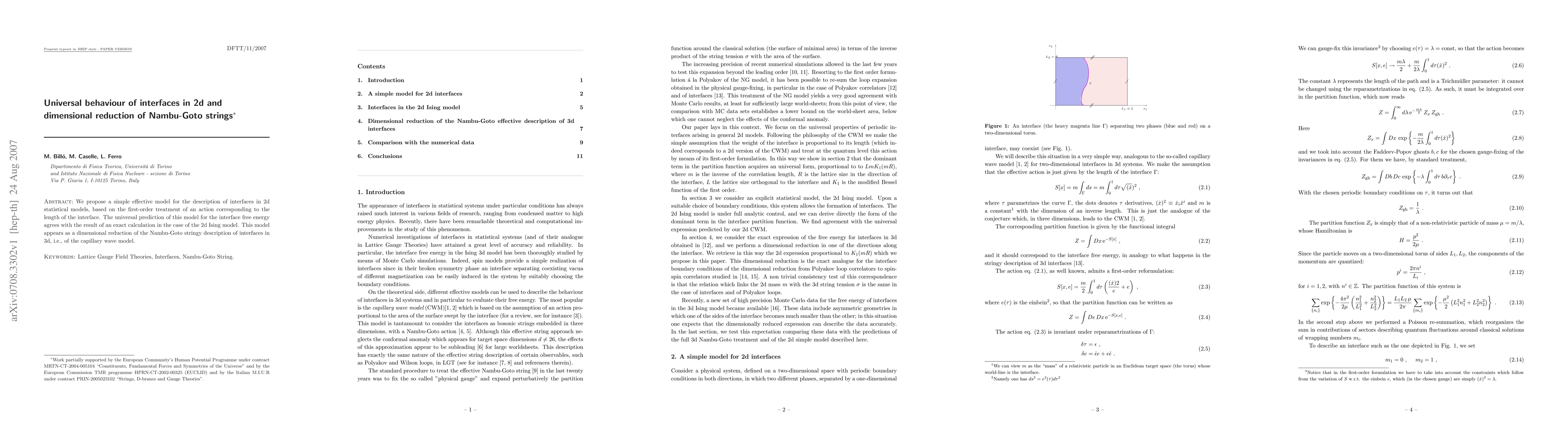 We propose a simple effective model for the description of interfaces in 2d statistical models, based on the first-order treatment of an action corresponding to the length of the interface. The universal prediction of this model for the interface free energy agrees with the result of an exact calculation in the case of the 2d Ising model. This model appears as a dimensional reduction of the Nambu-Goto stringy description of interfaces in 3d, i.e., of the capillary wave model.