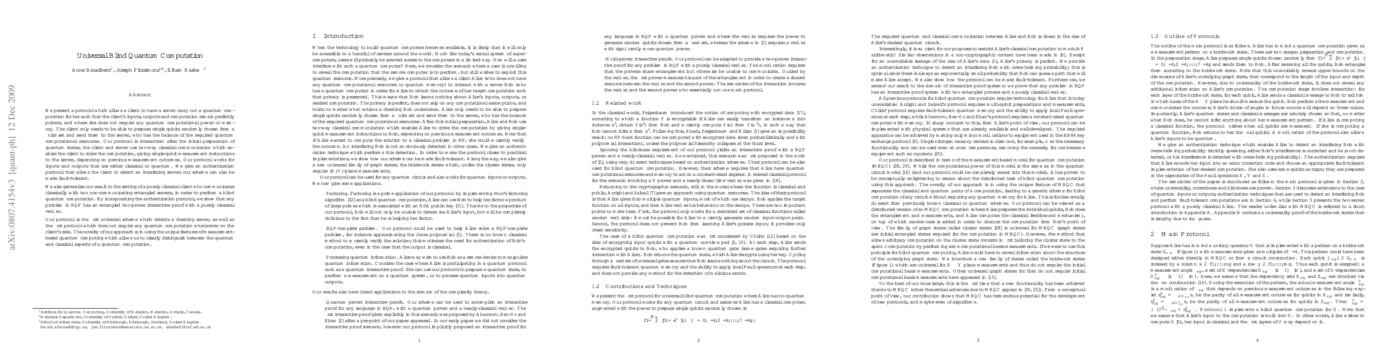 We present a protocol which allows a client to have a server carry out a quantum computation for her such that the client's inputs, outputs and computation remain perfectly private, and where she does not require any quantum computational power or memory. The client only needs to be able to prepare single qubits randomly chosen from a finite set and send them to the server, who has the balance of the required quantum computational resources. Our protocol is interactive: after the initial preparation of quantum states, the client and server use two-way classical communication which enables the client to drive the computation, giving single-qubit measurement instructions to the server, depending on previous measurement outcomes. Our protocol works for inputs and outputs that are either classical or quantum. We give an authentication protocol that allows the client to detect an interfering server; our scheme can also be made fault-tolerant. We also generalize our result to the setting of a purely classical client who communicates classically with two non-communicating entangled servers, in order to perform a blind quantum computation. By incorporating the authentication protocol, we show that any problem in BQP has an entangled two-prover interactive proof with a purely classical verifier. Our protocol is the first universal scheme which detects a cheating server, as well as the first protocol which does not require any quantum computation whatsoever on the client's side. The novelty of our approach is in using the unique features of measurement-based quantum computing which allows us to clearly distinguish between the quantum and classical aspects of a quantum computation.