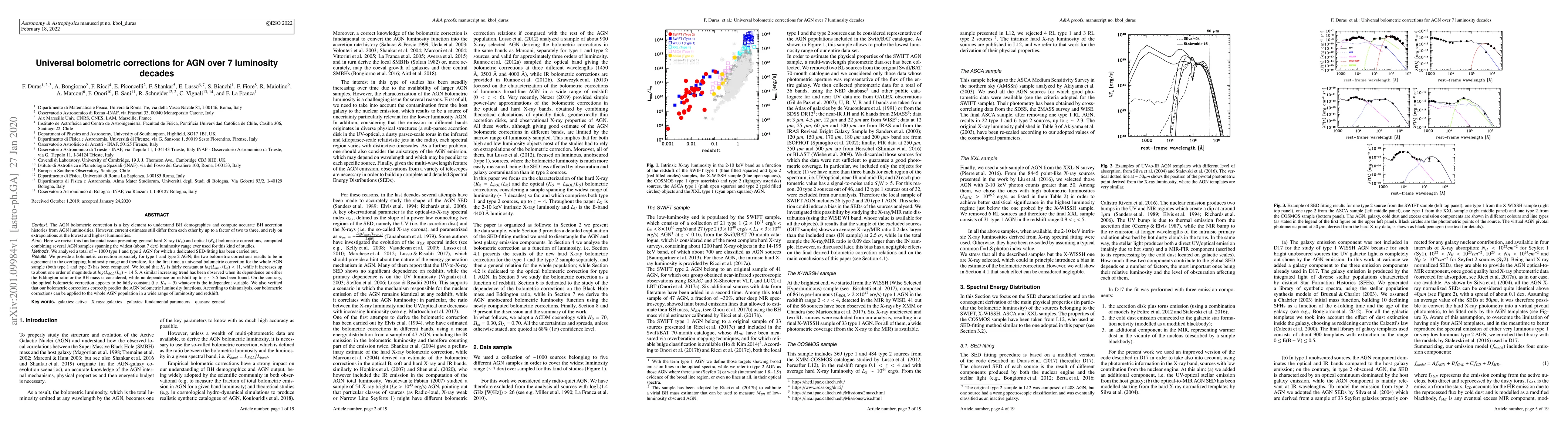 This paper presents universal bolometric corrections for Active Galactic Nuclei (AGN) across a broad luminosity range, derived from a comprehensive analysis of $\sim 1000$ type 1 and type 2 AGN. The study finds a consistent correction for both AGN types, revealing a stable $K_{X}$ correction at lower luminosities and a significant increase at higher luminosities, while $K_{O}$ remains nearly constant.