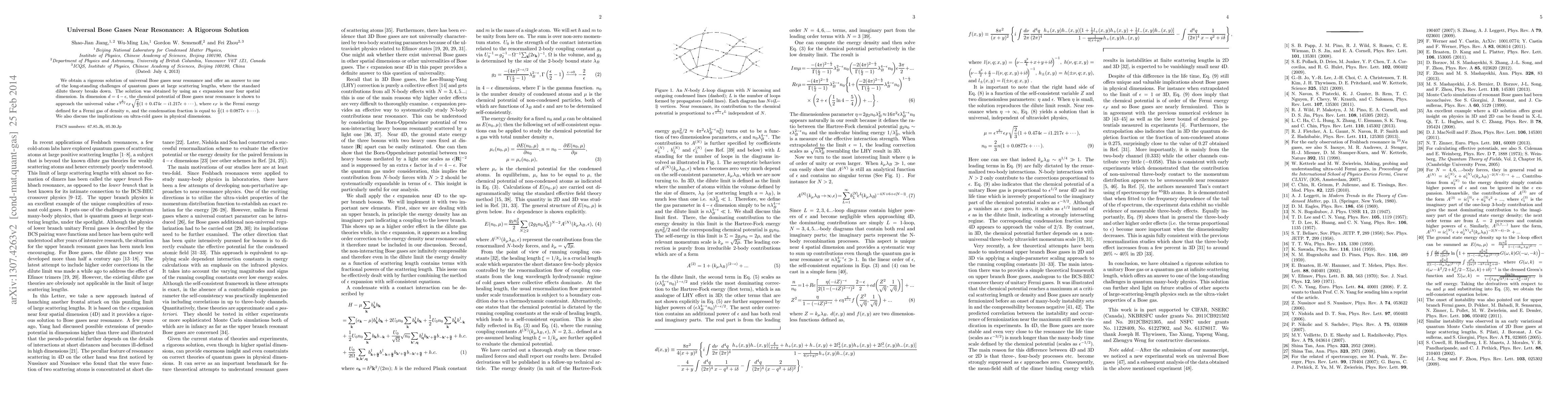 This paper provides a rigorous solution for universal Bose gases near resonance, addressing the breakdown of standard dilute theory at large scattering lengths. The solution employs an $\epsilon$ expansion in $d = 4 - \epsilon$ dimensions, revealing a universal chemical potential and a condensation fraction of $2/3$.