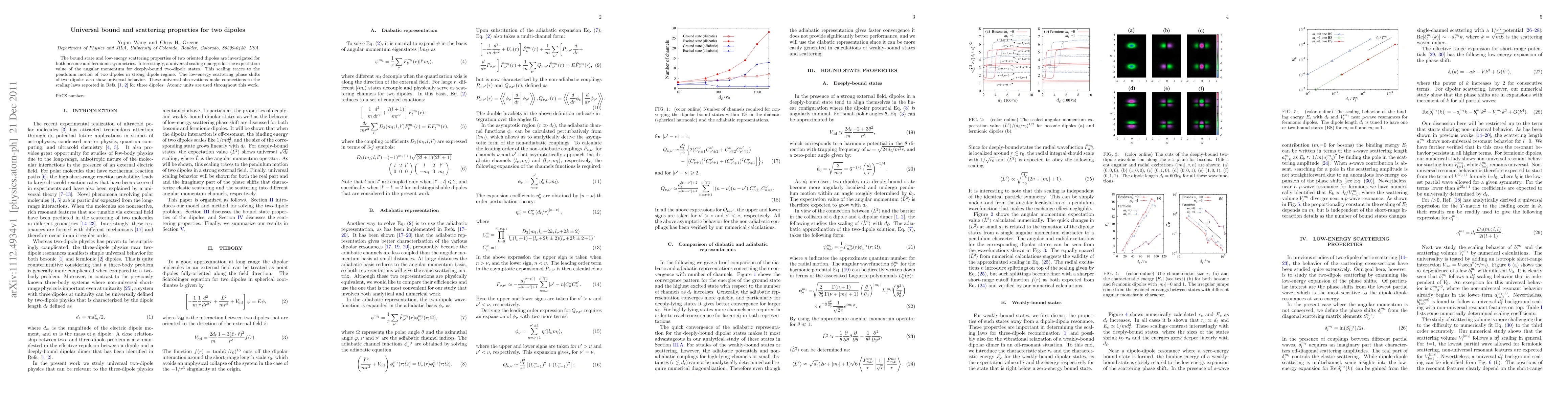 The bound state and low-energy scattering properties of two oriented dipoles are investigated for both bosonic and fermionic symmetries. Interestingly, a universal scaling emerges for the expectation value of the angular momentum for deeply-bound two-dipole states. This scaling traces to the pendulum motion of two dipoles in strong dipole regime. The low-energy scattering phase shifts of two dipoles also show universal behavior. These universal observations make connections to the scaling laws reported in Refs. [1, 2] for three dipoles. Atomic units are used throughout this work.