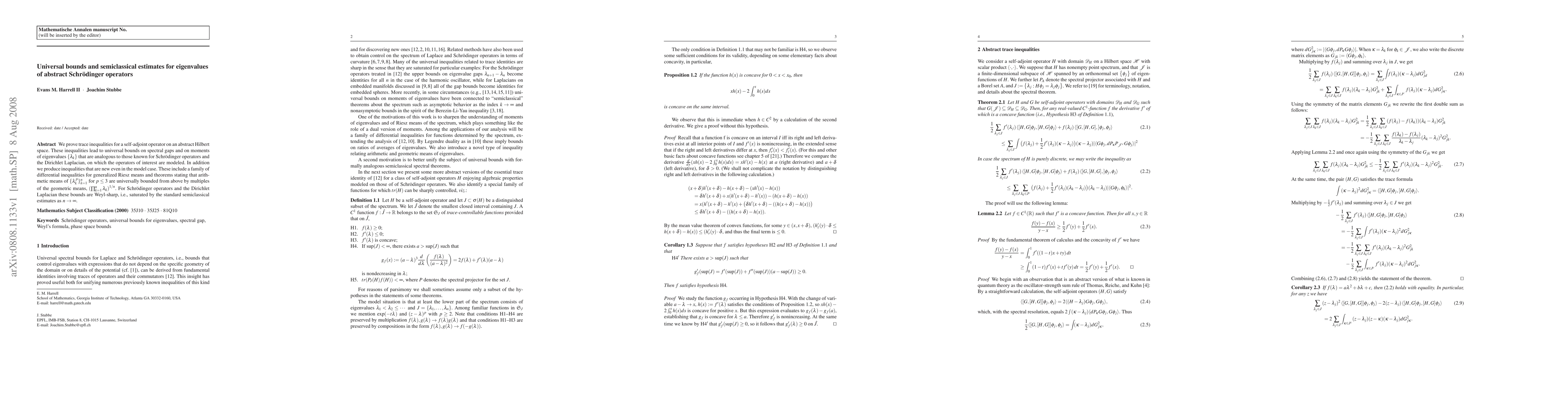 We prove trace inequalities for a self-adjoint operator on an abstract Hilbert space. These inequalities lead to universal bounds on spectral gaps and on moments of eigenvalues lambda_k that are analogous to those known for Schroedinger operators and the Dirichlet Laplacian, on which the operators of interest are modeled. In addition we produce inequalities that are new even in the model case. These include a family of differential inequalities for generalized Riesz means and theorems stating that arithmetic means of lambda_k^p for p <= 3 are universally bounded from above by multiples of the geometric mean of the lambda_k. For Schroedinger operators and the Dirichlet Laplacian these bounds are Weyl-sharp, i.e., saturated by the standard semiclassical estimates for lambda_k at large k.