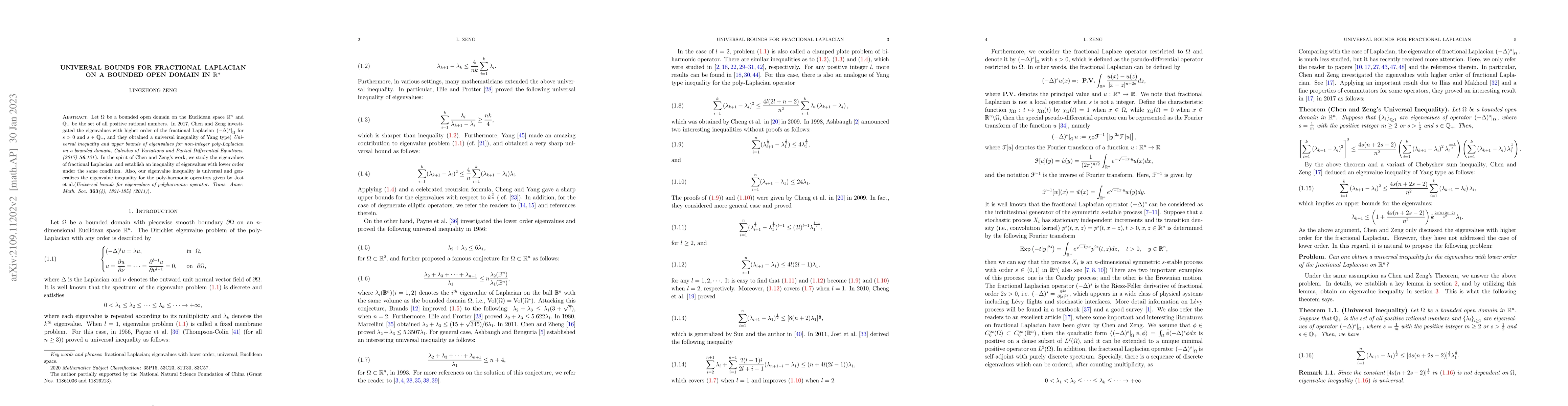 This paper investigates the eigenvalues of the fractional Laplacian on a bounded open domain in $\mathbb{R}^{n}$, establishing a universal inequality for lower order eigenvalues. It generalizes previous results by Chen and Zeng and Jost et al. for higher order eigenvalues and polyharmonic operators.