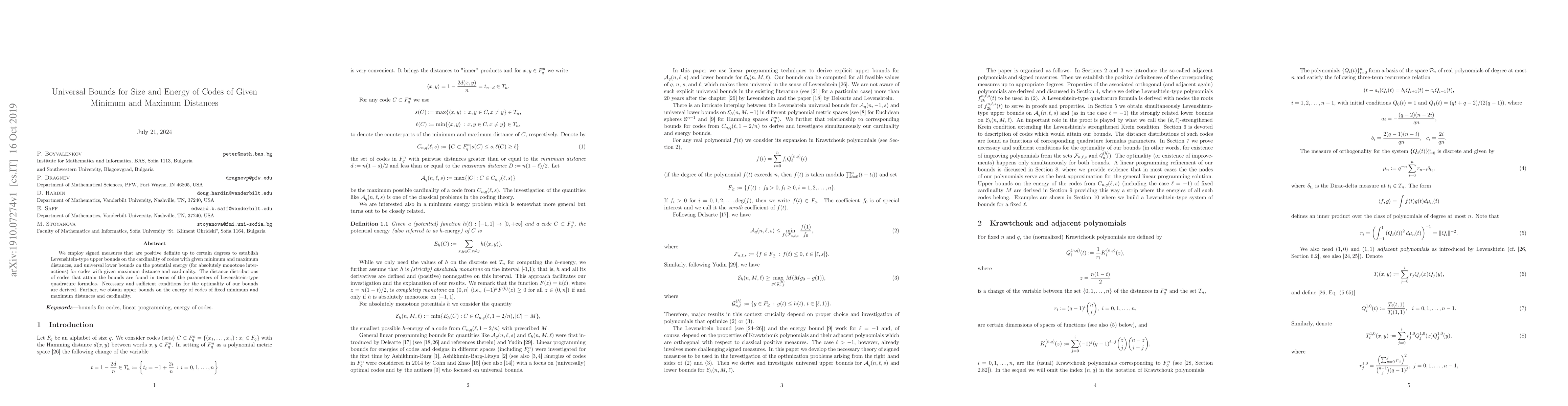 This paper establishes universal bounds on the size and energy of codes with specified minimum and maximum distances using positive definite signed measures. It provides Levenshtein-type upper bounds and universal lower bounds on potential energy, with optimality conditions derived for these bounds.