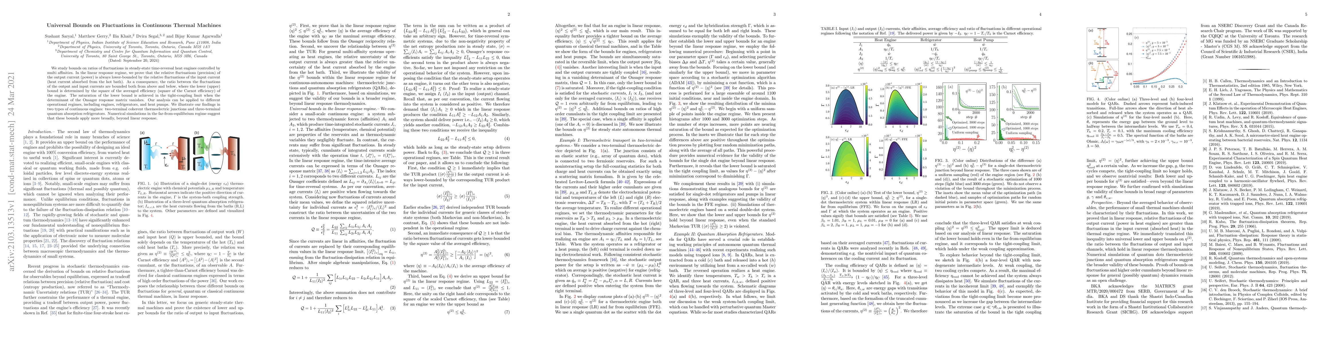 The paper presents a detailed theoretical analysis of universal bounds on fluctuations in continuous thermal machines, applying to heat engines, refrigerators, and heat pumps, both in linear response and beyond.