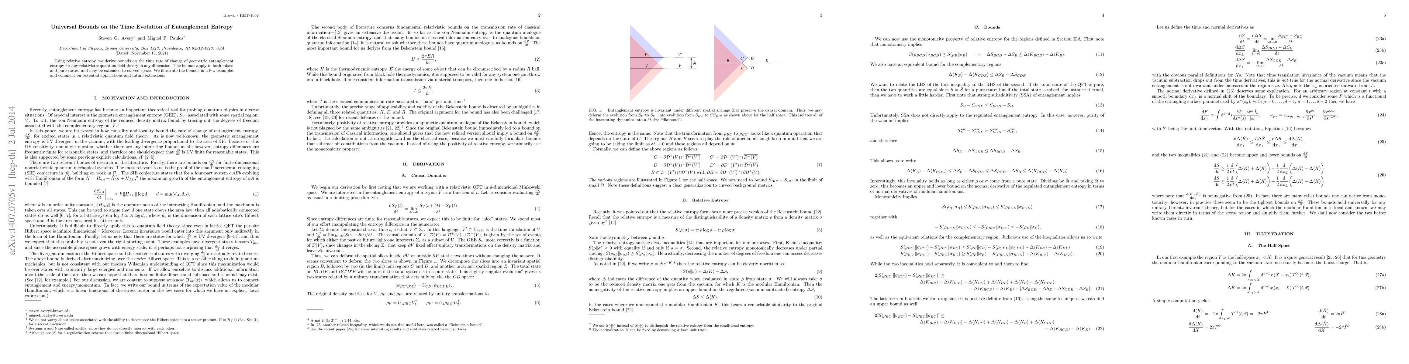 Using relative entropy, we derive bounds on the time rate of change of geometric entanglement entropy for any relativistic quantum field theory in any dimension. The bounds apply to both mixed and pure states, and may be extended to curved space. We illustrate the bounds in a few examples and comment on potential applications and future extensions.