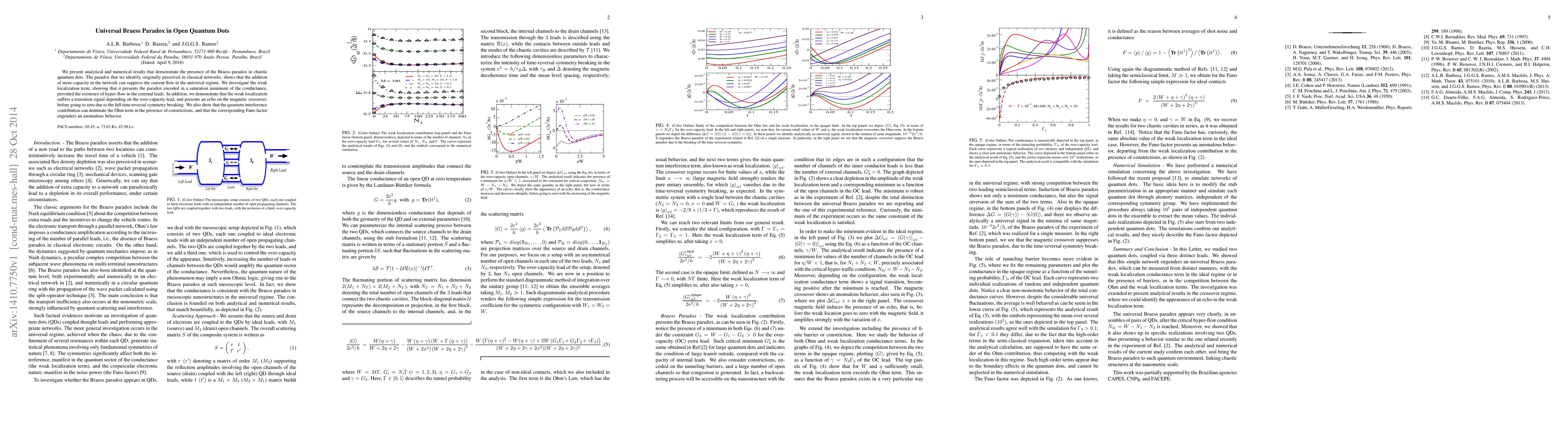 We present analytical and numerical results that demonstrate the presence of the Braess paradox in chaotic quantum dots. The paradox that we identify, originally perceived in classical networks, shows that the addition of more capacity to the network can suppress the current flow in the universal regime. We investigate the weak localization term, showing that it presents the paradox encoded in a saturation minimum of the conductance, under the presence of hyperflow in the external leads. In addition, we demonstrate that the weak localization suffers a transition signal depending on the overcapacity lead and presents an echo on the magnetic crossover before going to zero due to the full time-reversal symmetry breaking.We also show that the quantum interference contribution can dominate the Ohm term in the presence of constrictions and that the corresponding Fano factor engenders an anomalous behavior