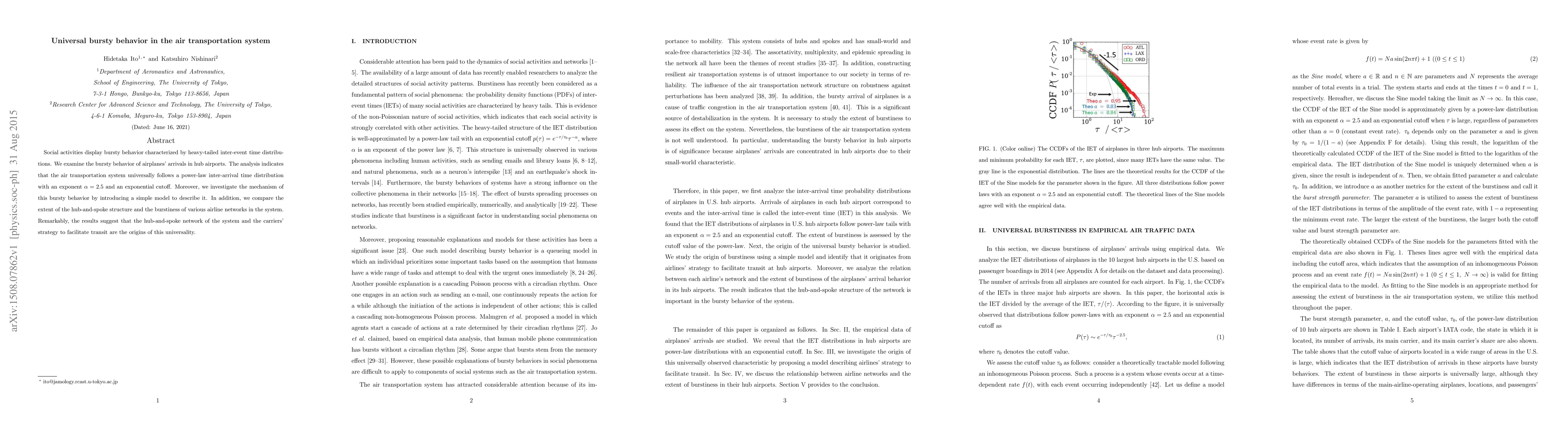 This paper investigates the universal bursty behavior in the air transportation system, revealing a power-law inter-arrival time distribution for airplane arrivals in hub airports. The study attributes this pattern to the hub-and-spoke network structure and airlines' transit facilitation strategies.