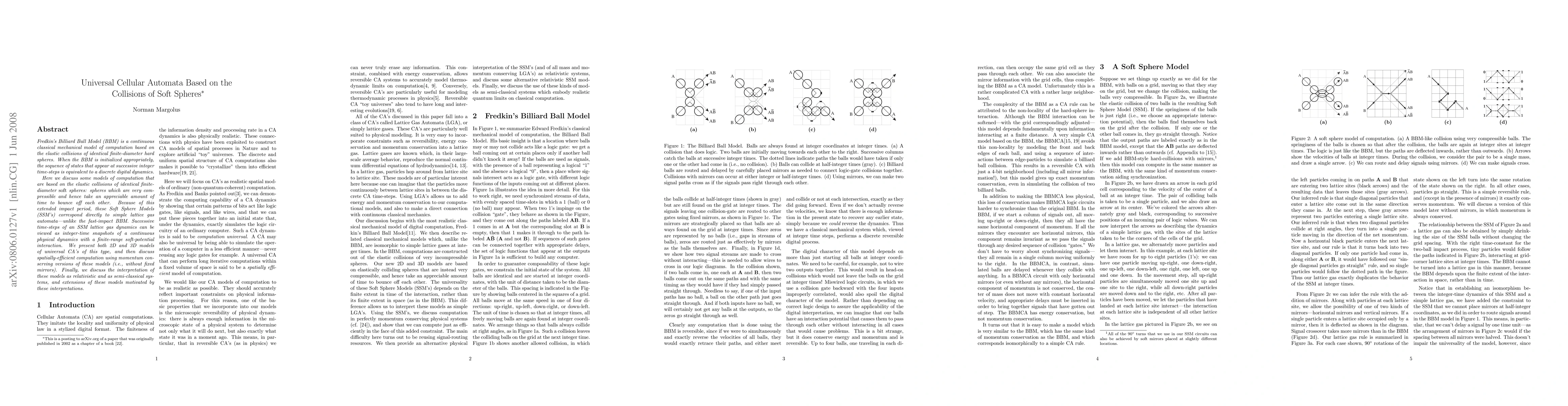 This paper explores cellular automata models based on the elastic collisions of compressible soft spheres, contrasting them with Fredkin's hard-sphere billiard ball model. It presents 2D and 3D universal cellular automata models that directly correspond to lattice gas automata due to the extended impact time of soft spheres, and discusses their computational efficiency and relativistic interpretations.