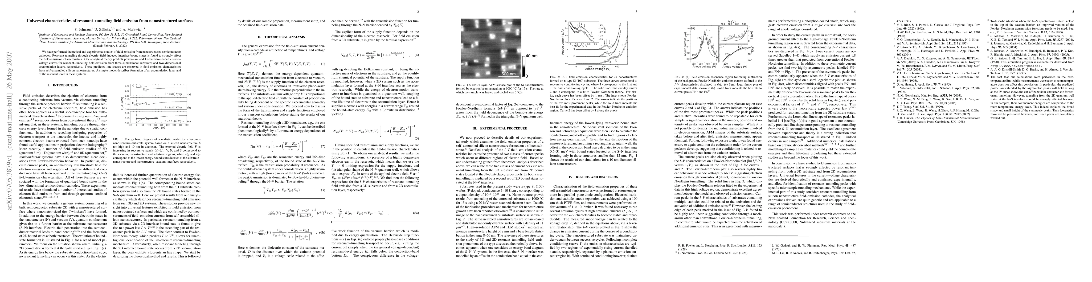 This paper presents theoretical and experimental studies on field emission from nanostructured semiconductor cathodes, revealing that resonant tunneling through electric-field-induced interface bound states significantly influences emission characteristics. The study predicts and observes distinct power-law and Lorentzian current-voltage curves for three-dimensional substrates and two-dimensional layers, respectively, in self-assembled silicon nanostructures.