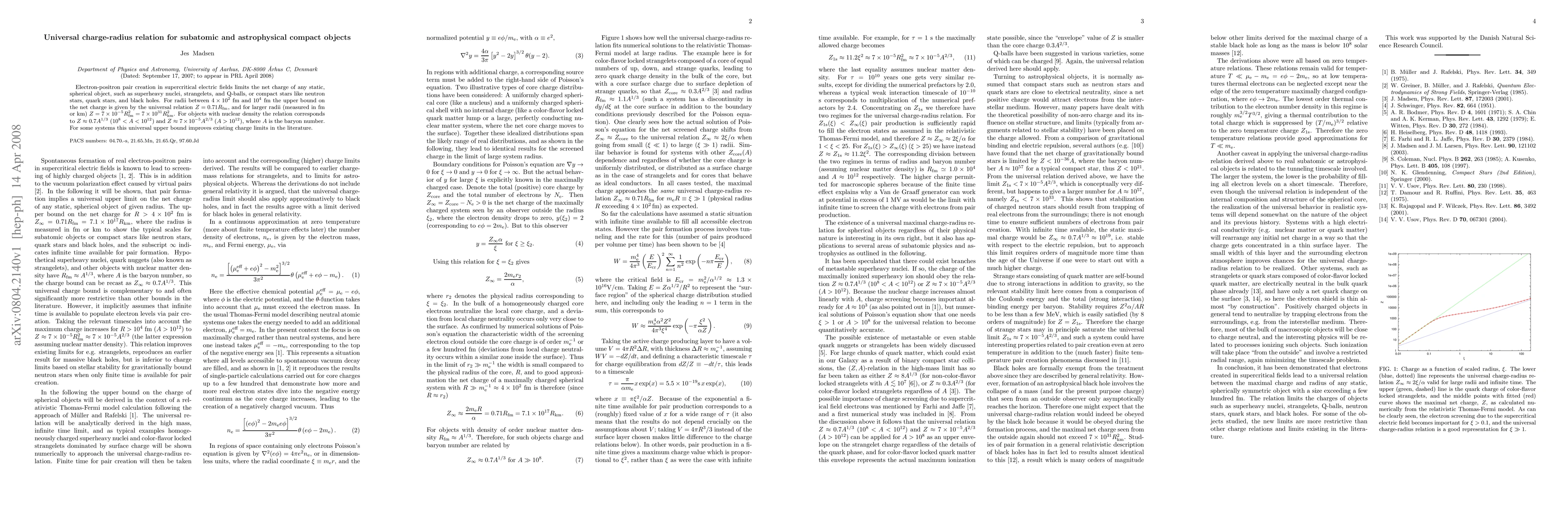 Electron-positron pair creation in supercritical electric fields limits the net charge of any static, spherical object, such as superheavy nuclei, strangelets, and Q-balls, or compact stars like neutron stars, quark stars, and black holes. For radii between $4\times10^2$ fm and $10^4$ fm the upper bound on the net charge is given by the universal relation $Z=0.71R_{fm}$, and for larger radii (measured in fm or km) $Z = 7 \times 10^{-5} R_{fm}^2 = 7 \times 10^{31} R_{km}^2$. For objects with nuclear density the relation corresponds to $Z \approx 0.7 A^{1/3}$ ($10^{8} < A < 10^{12}$) and $Z \approx 7\times10^{-5} A^{2/3}$ ($A > 10^{12}$), where $A$ is the baryon number. For some systems this universal upper bound improves existing charge limits in the literature.