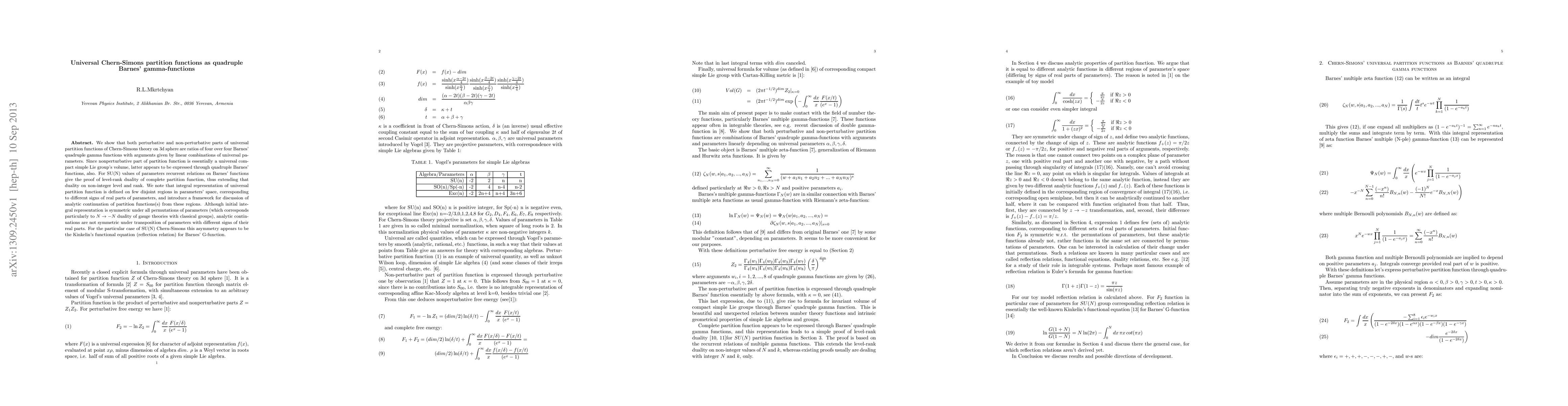 This paper demonstrates that universal partition functions in Chern-Simons theory on a 3d sphere relate to quadruple Barnes' gamma functions, providing a proof of level-rank duality for SU(N) through these functions and discussing analytic continuation across different regions in the parameters' space.