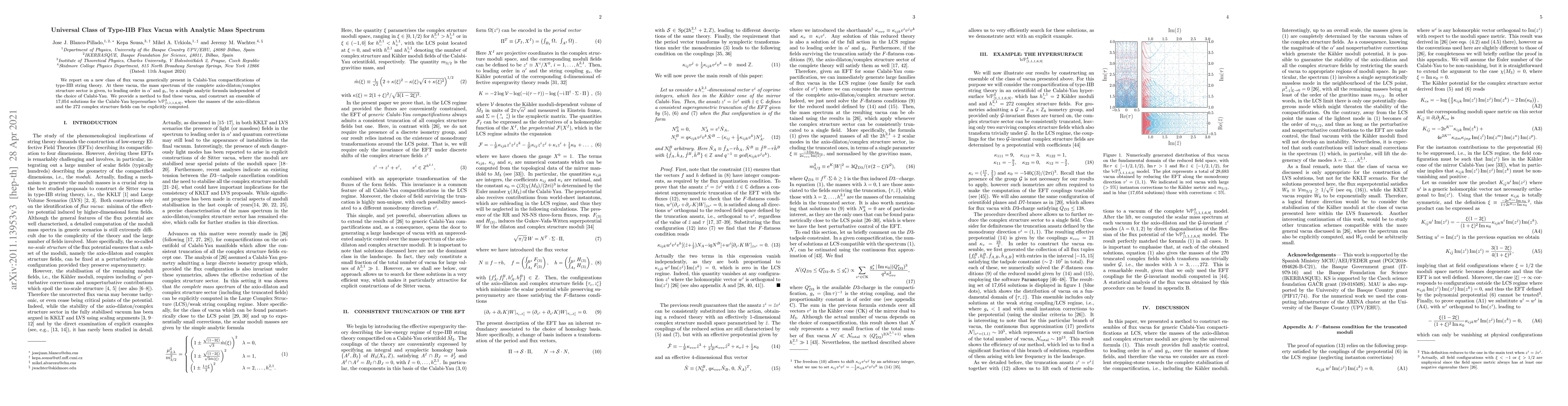 This paper introduces a novel class of flux vacua in type-IIB string theory, showing an analytic mass spectrum formula for axio-dilaton and complex structure fields. It provides a method to identify these vacua and constructs 17,054 solutions for a specific Calabi-Yau manifold, allowing explicit computation of field masses.