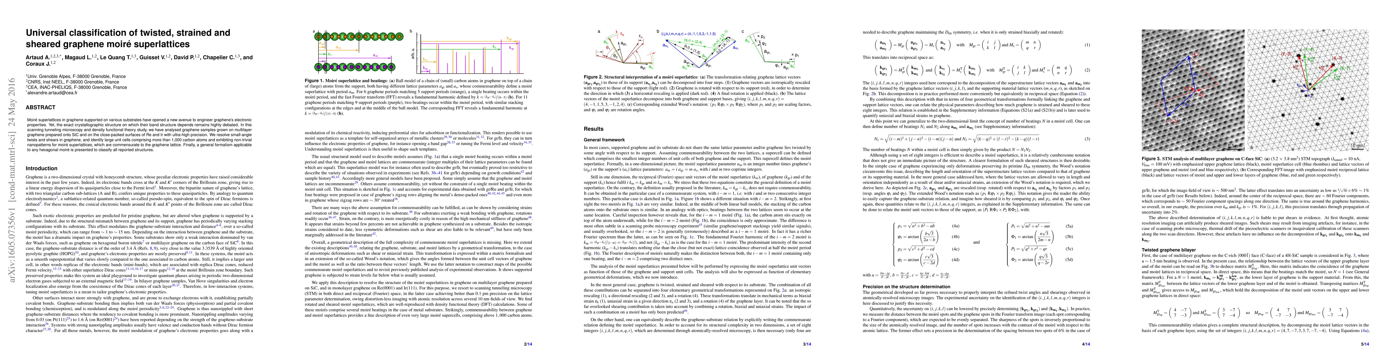 This study employs scanning tunneling microscopy and density functional theory to analyze graphene moiré superlattices, identifying their crystallographic structures and band dependencies. A universal classification formalism is proposed to categorize all known hexagonal moiré superlattices, resolving structural ambiguities and enhancing the understanding of their electronic properties.