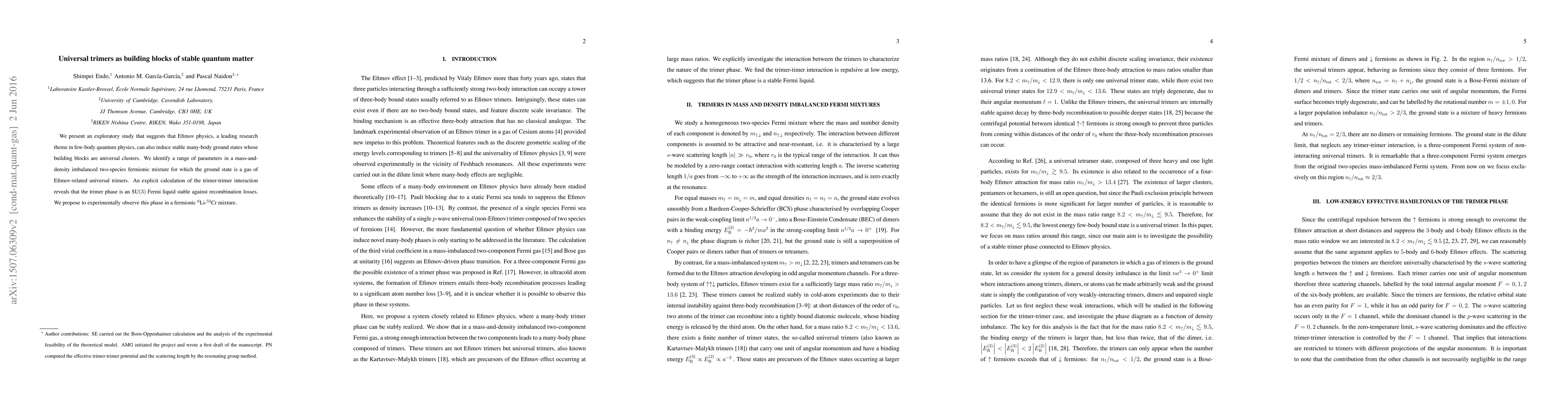 We present an exploratory study that suggests that Efimov physics, a leading research theme in few-body quantum physics, can also induce stable many-body ground states whose building blocks are universal clusters. We identify a range of parameters in a mass-and-density imbalanced two-species fermionic mixture for which the ground state is a gas of Efimov-related universal trimers. An explicit calculation of the trimer-trimer interaction reveals that the trimer phase is an SU$(3)$ Fermi liquid stable against recombination losses. We propose to experimentally observe this phase in a fermionic $^6$Li-$^{53}$Cr mixture.