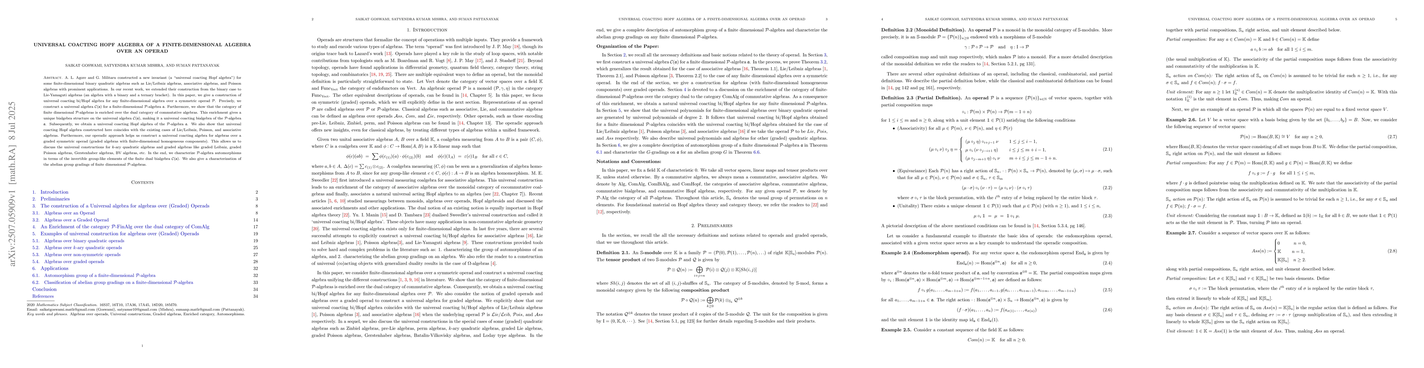 A. L. Agore and G. Militaru constructed a new invariant (a ``universal coacting Hopf algebra") for some finite-dimensional binary quadratic algebras such as Lie/Leibniz algebras, associative algebras, and Poisson algebras with prominent applications. In this paper, we give a construction of universal coacting bi/Hopf algebra for any finite-dimensional algebra over a symmetric operad $\mathcal{P}$. Precisely, we construct a universal algebra $\mathcal{C}(\mathfrak{a})$ for a finite-dimensional $\mathcal{P}$-algebra $\mathfrak{a}$. Furthermore, we show that the category of finite dimensional $\mathcal{P}$-algebras is enriched over the dual category of commutative algebras. This enrichment gives a unique bialgebra structure on the universal algebra $\mathcal{C}(\mathfrak{a})$, making it a universal coacting bialgebra of the $\mathcal{P}$-algebra $\mathfrak{a}$. Subsequently, we obtain a universal coacting Hopf algebra of the $\mathcal{P}$-algebra $\mathfrak{a}$. We also show that universal coacting Hopf algebra constructed here coincides with the existing cases of Lie/Leibniz, Poisson, and associative algebras. Furthermore, our operadic approach helps us construct a universal coacting algebra for algebras over a graded symmetric operad (graded algebras with finite-dimensional homogeneous components). This allows us to discuss the universal constructions for $k$-ary quadratic algebras and graded algebras like graded Leibniz, graded Poisson algebras, Gerstenhaber algebras, BV algebras, etc. In the end, we characterize $\mathcal{P}$-algebra automorphisms in terms of the invertible group-like elements of the finite dual bialgebra $\mathcal{C}(\mathfrak{a})$. We also give a characterization of the abelian group gradings of finite dimensional $\mathcal{P}$-algebras.