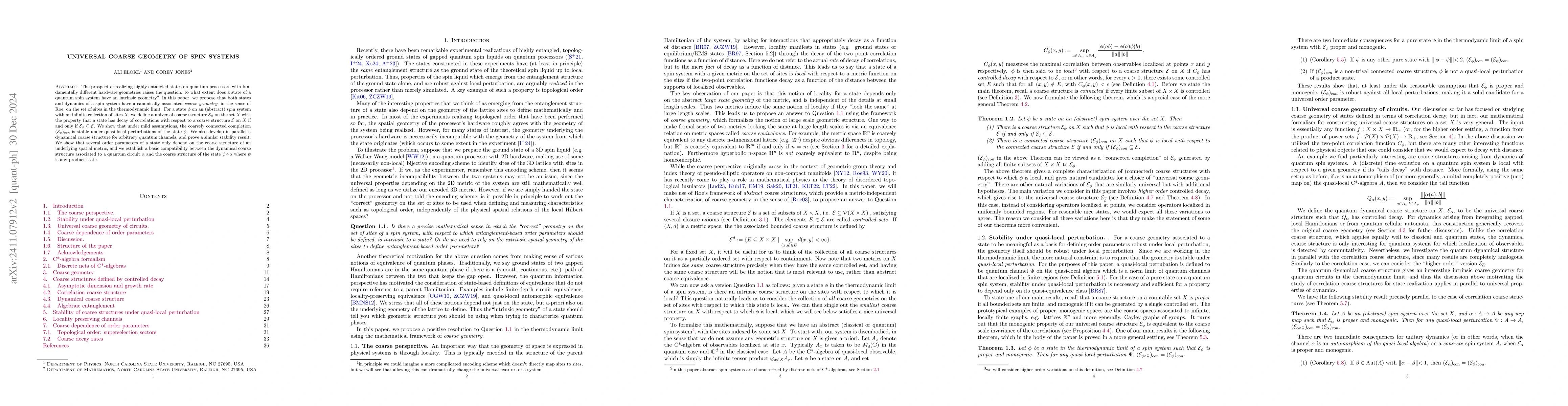 This paper proposes a universal coarse geometry for quantum spin systems, showing that both states and dynamics possess a canonically associated coarse structure. It demonstrates the stability of this structure under perturbations and reveals that certain order parameters depend only on the coarse geometry.