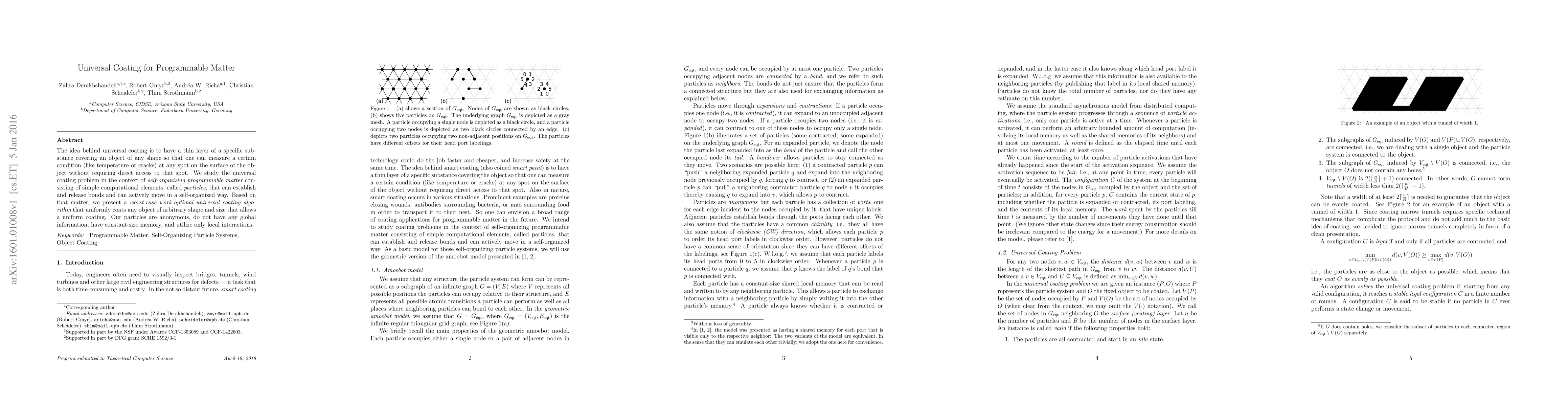 The idea behind universal coating is to have a thin layer of a specific substance covering an object of any shape so that one can measure a certain condition (like temperature or cracks) at any spot on the surface of the object without requiring direct access to that spot. We study the universal coating problem in the context of self-organizing programmable matter consisting of simple computational elements, called particles, that can establish and release bonds and can actively move in a self-organized way. Based on that matter, we present a worst-case work-optimal universal coating algorithm that uniformly coats any object of arbitrary shape and size that allows a uniform coating. Our particles are anonymous, do not have any global information, have constant-size memory, and utilize only local interactions.