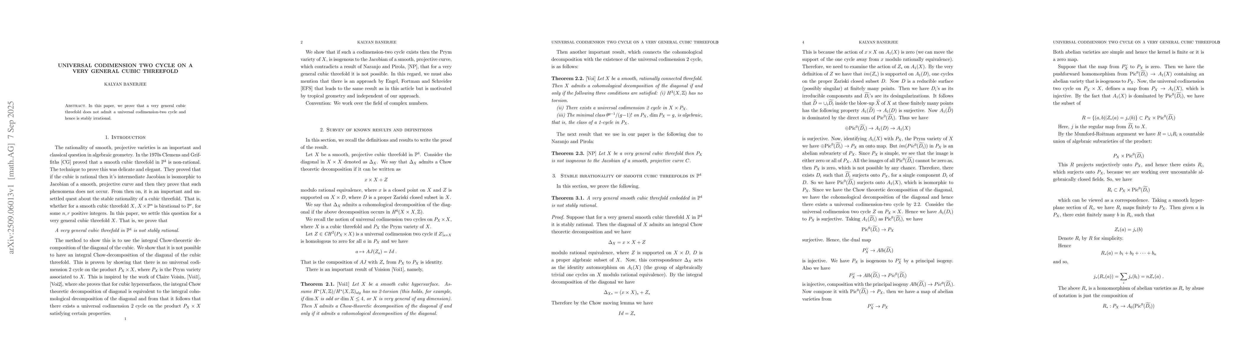 In this paper, we prove that a very general cubic threefold does not admit a universal codimension-two cycle and hence is stably irrational.