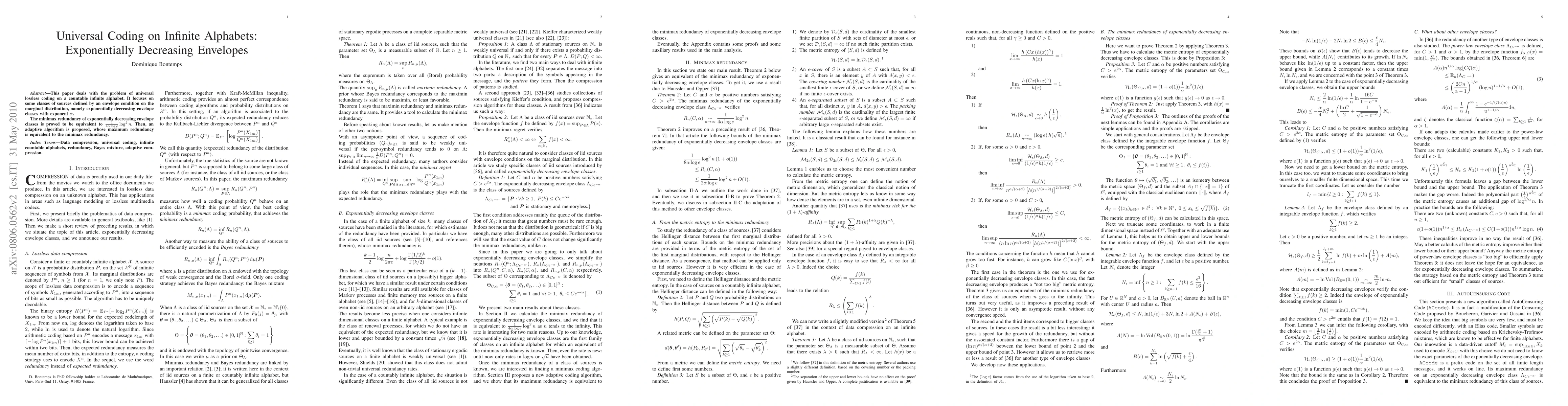 This paper addresses universal lossless coding on infinite alphabets, focusing on sources with exponentially decreasing envelope classes. It establishes that the minimax redundancy for such classes is $\frac{1}{4 \alpha \log e} \log^2 n$, and presents a coding strategy and adaptive algorithm achieving this redundancy.