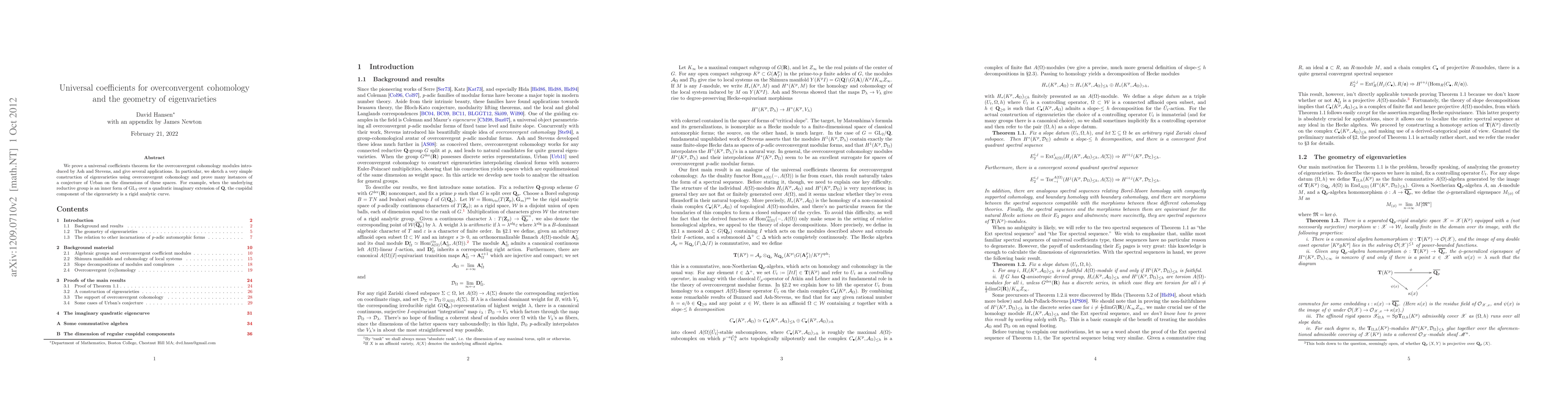 Title: Universal coefficients for overconvergent cohomology and the geometry of eigenvarieties Summary: The paper establishes a universal coefficients theorem for overconvergent cohomology modules and applies it to construct eigenvarieties, proving specific instances of Urban's conjecture on their dimensions, notably showing that the cuspidal component is a rigid analytic curve for inner forms of GL(2).