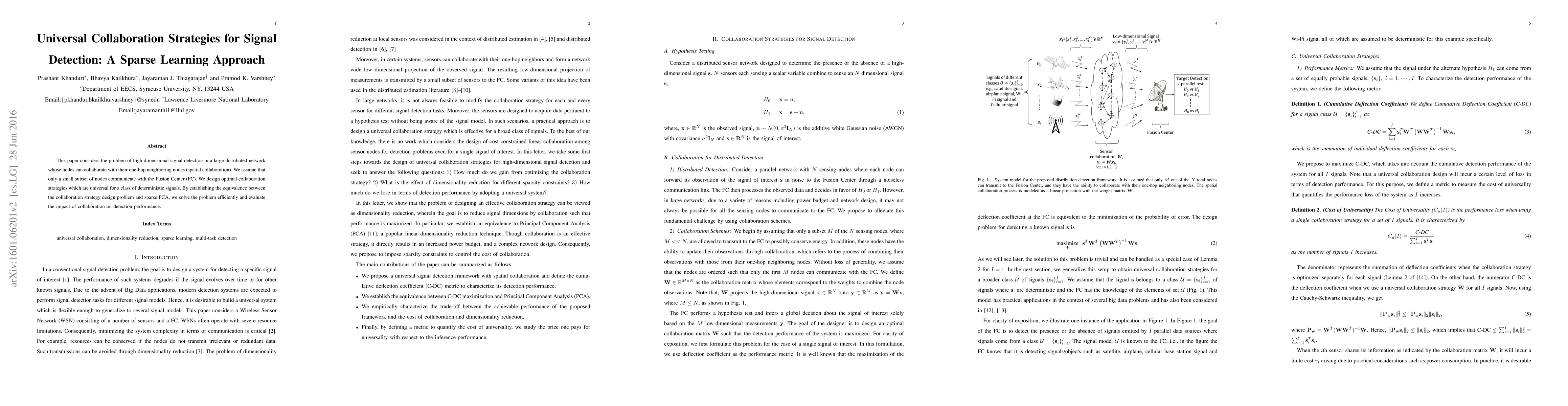Researchers developed universal collaboration strategies for signal detection in a large network, improving detection performance through spatial collaboration with neighboring nodes. Their approach equates to sparse PCA and efficiently solves the problem for a class of deterministic signals.