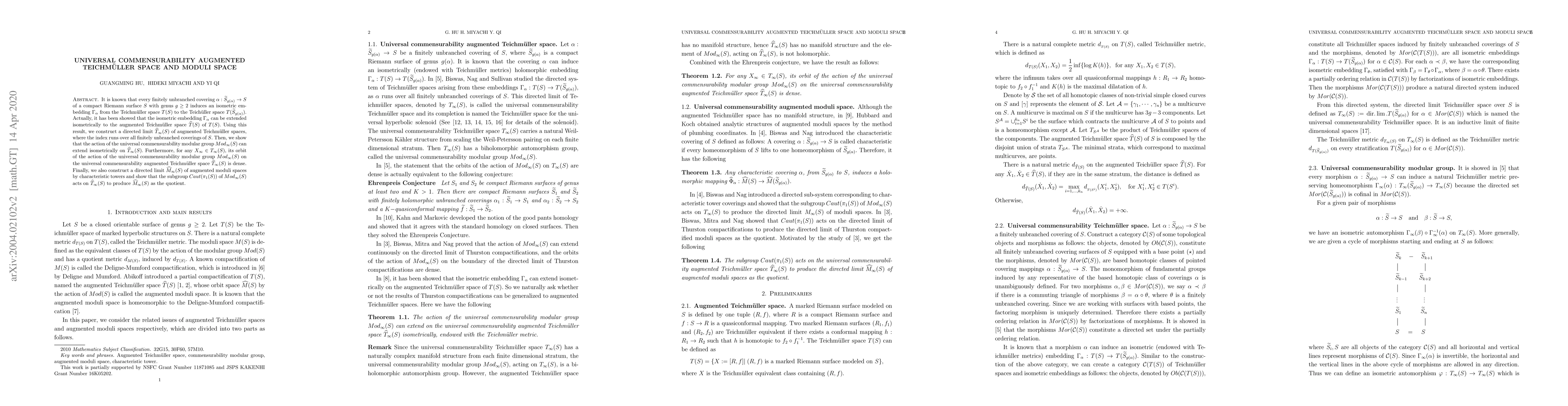 It is known that every finitely unbranched covering $\alpha:\widetilde{S}_{g(\alpha)}\rightarrow S$ of a compact Riemann surface $S$ with genus $g\geq2$ induces an isometric embedding $\Gamma_{\alpha}$ from the Teichm\"uller space $T(S)$ to the Teich\"uller space $T(\widetilde{S}_{g(\alpha)})$. Actually, it has been showed that the isometric embedding $\Gamma_{\alpha}$ can be extended isometrically to the augmented Teichm\"{u}ller space $\widehat{T}(S)$ of $T(S)$. Using this result, we construct a directed limit $\widehat{T}_{\infty}(S)$ of augmented Teichm\"uller spaces, where the index runs over all finitely unbranched coverings of $S$. Then, we show that the action of the universal commensurability modular group $Mod_{\infty}(S)$ can extend isometrically on $\widehat{T}_{\infty}(S)$. Furthermore, for any $X_{\infty}\in T_{\infty}(S)$, its orbit of the action of the universal commensurability modular group $Mod_{\infty}(S)$ on the universal commensurability augmented Teichm\"uller space $\widehat{T}_{\infty}(S)$ is dense. Finally, we also construct a directed limit $\widehat{M}_{\infty}(S)$ of augmented moduli spaces by characteristic towers and show that the subgroup $Caut(\pi_{1}(S))$ of $Mod_{\infty}(S)$ acts on $\widehat{T}_{\infty}(S)$ to produce $\widehat{M}_{\infty}(S)$ as the quotient.