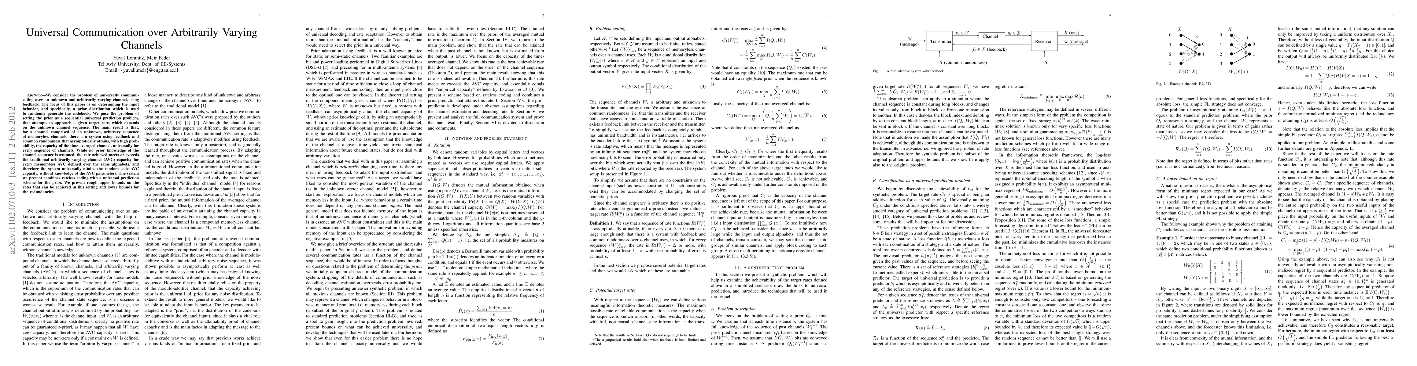 This paper addresses universal communication over unknown, arbitrarily varying channels using feedback and common randomness. It proposes a system combining rateless coding and a universal prediction scheme to achieve capacities meeting or exceeding traditional arbitrarily varying channel capacities without prior knowledge of channel parameters.