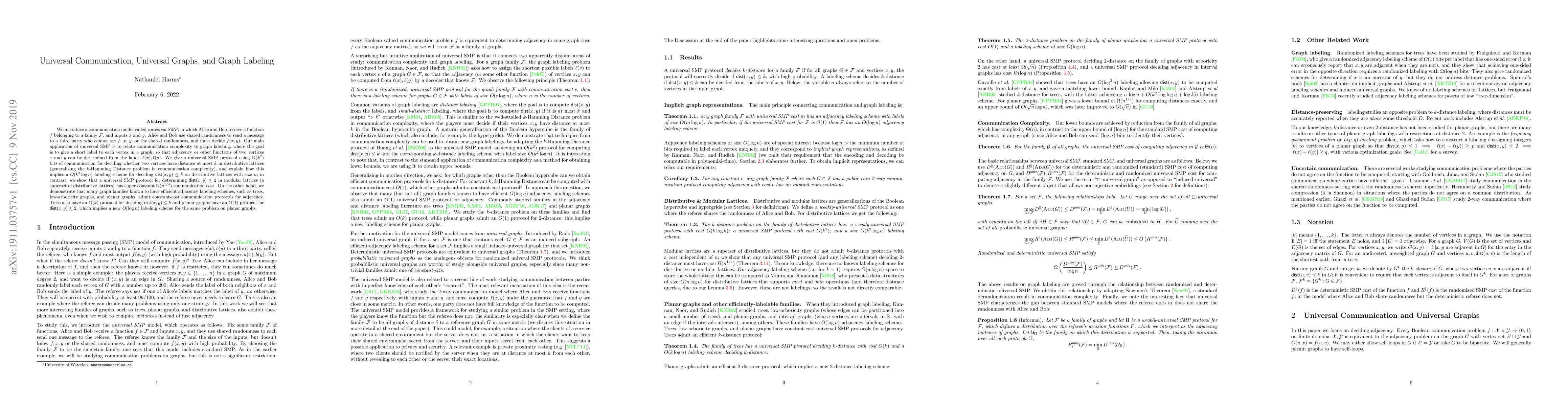 We introduce a communication model called universal SMP, in which Alice and Bob receive a function $f$ belonging to a family $\mathcal{F}$, and inputs $x$ and $y$. Alice and Bob use shared randomness to send a message to a third party who cannot see $f, x, y$, or the shared randomness, and must decide $f(x,y)$. Our main application of universal SMP is to relate communication complexity to graph labeling, where the goal is to give a short label to each vertex in a graph, so that adjacency or other functions of two vertices $x$ and $y$ can be determined from the labels $\ell(x),\ell(y)$. We give a universal SMP protocol using $O(k^2)$ bits of communication for deciding whether two vertices have distance at most $k$ on distributive lattices (generalizing the $k$-Hamming Distance problem in communication complexity), and explain how this implies an $O(k^2\log n)$ labeling scheme for determining $\mathrm{dist}(x,y) \leq k$ on distributive lattices with size $n$; in contrast, we show that a universal SMP protocol for determining $\mathrm{dist}(x,y) \leq 2$ in modular lattices (a superset of distributive lattices) has super-constant $\Omega(n^{1/4})$ communication cost. On the other hand, we demonstrate that many graph families known to have efficient adjacency labeling schemes, such as trees, low-arboricity graphs, and planar graphs, admit constant-cost communication protocols for adjacency. Trees also have an $O(k)$ protocol for deciding $\mathrm{dist}(x,y) \leq k$ and planar graphs have an $O(1)$ protocol for $\mathrm{dist}(x,y) \leq 2$, which implies a new $O(\log n)$ labeling scheme for the same problem on planar graphs.