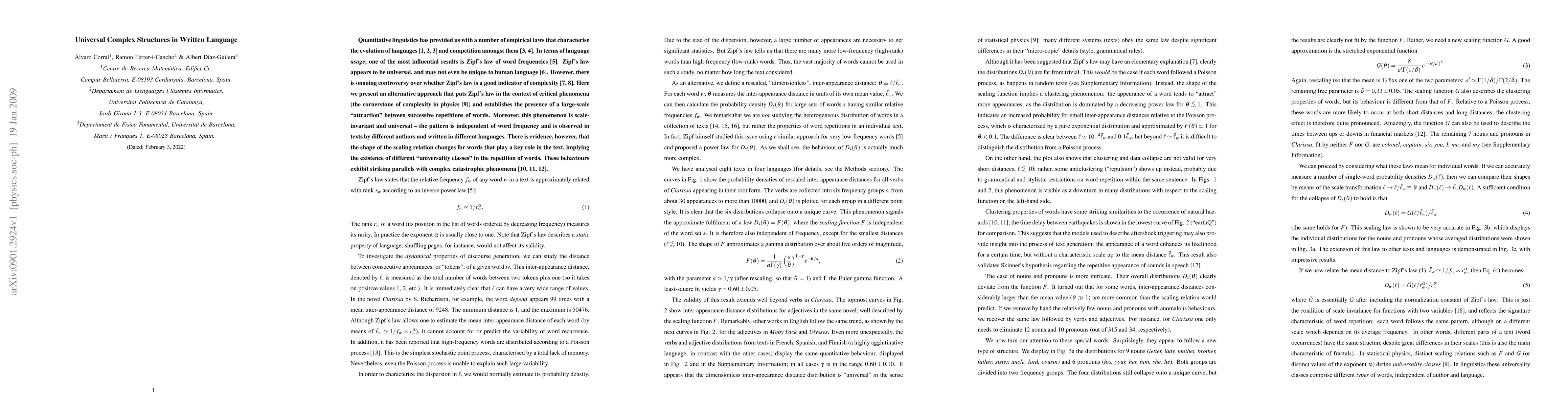 Quantitative linguistics has provided us with a number of empirical laws that characterise the evolution of languages and competition amongst them. In terms of language usage, one of the most influential results is Zipf's law of word frequencies. Zipf's law appears to be universal, and may not even be unique to human language. However, there is ongoing controversy over whether Zipf's law is a good indicator of complexity. Here we present an alternative approach that puts Zipf's law in the context of critical phenomena (the cornerstone of complexity in physics) and establishes the presence of a large scale "attraction" between successive repetitions of words. Moreover, this phenomenon is scale-invariant and universal -- the pattern is independent of word frequency and is observed in texts by different authors and written in different languages. There is evidence, however, that the shape of the scaling relation changes for words that play a key role in the text, implying the existence of different "universality classes" in the repetition of words. These behaviours exhibit striking parallels with complex catastrophic phenomena.