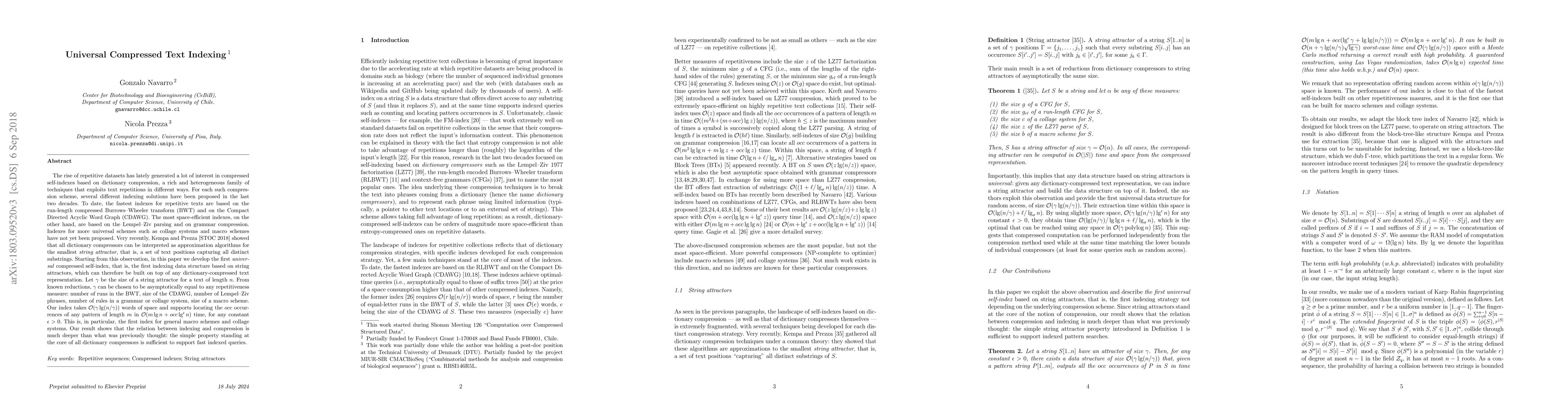 The rise of repetitive datasets has lately generated a lot of interest in compressed self-indexes based on dictionary compression, a rich and heterogeneous family that exploits text repetitions in different ways. For each such compression scheme, several different indexing solutions have been proposed in the last two decades. To date, the fastest indexes for repetitive texts are based on the run-length compressed Burrows-Wheeler transform and on the Compact Directed Acyclic Word Graph. The most space-efficient indexes, on the other hand, are based on the Lempel-Ziv parsing and on grammar compression. Indexes for more universal schemes such as collage systems and macro schemes have not yet been proposed. Very recently, Kempa and Prezza [STOC 2018] showed that all dictionary compressors can be interpreted as approximation algorithms for the smallest string attractor, that is, a set of text positions capturing all distinct substrings. Starting from this observation, in this paper we develop the first universal compressed self-index, that is, the first indexing data structure based on string attractors, which can therefore be built on top of any dictionary-compressed text representation. Let $\gamma$ be the size of a string attractor for a text of length $n$. Our index takes $O(\gamma\log(n/\gamma))$ words of space and supports locating the $occ$ occurrences of any pattern of length $m$ in $O(m\log n + occ\log^{\epsilon}n)$ time, for any constant $\epsilon>0$. This is, in particular, the first index for general macro schemes and collage systems. Our result shows that the relation between indexing and compression is much deeper than what was previously thought: the simple property standing at the core of all dictionary compressors is sufficient to support fast indexed queries.