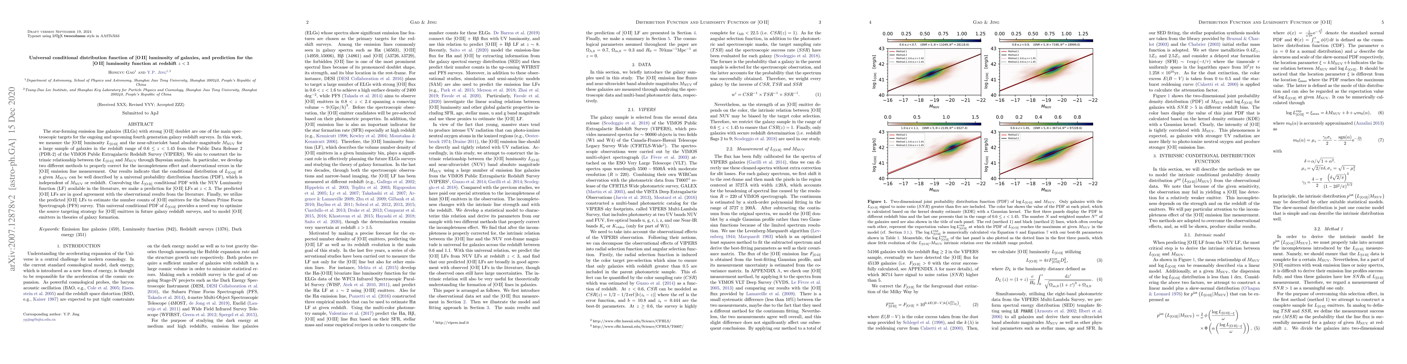 This paper measures the [OII] luminosity and NUV magnitude for galaxies to construct a universal conditional distribution of [OII] luminosity, independent of NUV magnitude or redshift. The study predicts [OII] luminosity functions at redshifts less than 3, which align with observational data, and suggests using the derived distribution to optimize future galaxy surveys targeting [OII] emitters.