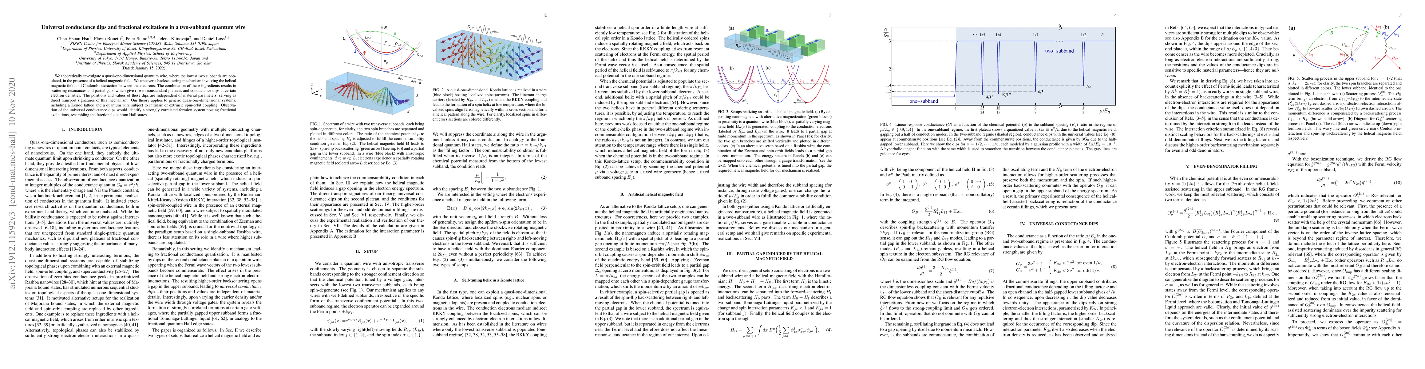 We theoretically investigate a quasi-one-dimensional quantum wire, where the lowest two subbands are populated, in the presence of a helical magnetic field. We uncover a backscattering mechanism involving the helical magnetic field and Coulomb interaction between the electrons. The combination of these ingredients results in scattering resonances and partial gaps which give rise to non-standard plateaus and conductance dips at certain electron densities. The positions and values of these dips are independent of material parameters, serving as direct transport signatures of this mechanism. Our theory applies to generic quasi-one-dimensional systems, including a Kondo lattice and a quantum wire subject to intrinsic or extrinsic spin-orbit coupling. Observation of the universal conductance dips would identify a strongly correlated fermion system hosting fractional excitations, resembling the fractional quantum Hall states.