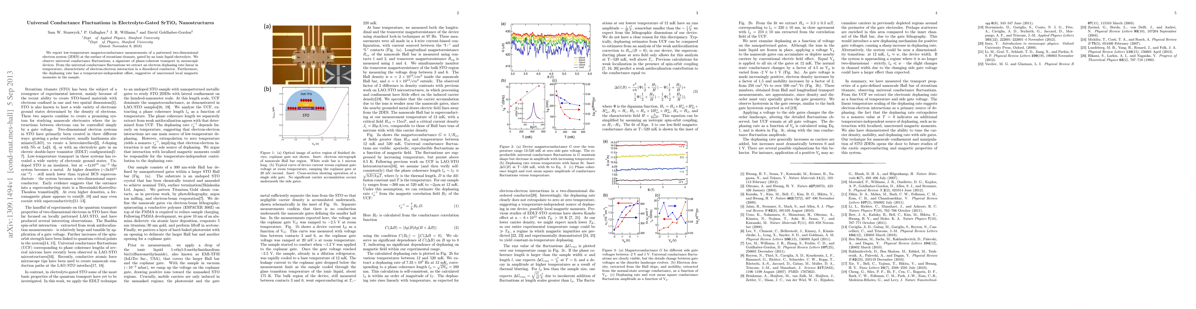 This paper reports on low-temperature magnetoconductance measurements of SrTiO3 nanostructures gated by an ionic liquid electrolyte, revealing universal conductance fluctuations indicative of phase-coherent transport. The study finds an electron dephasing rate linear in temperature due to electron-electron interactions, along with a temperature-independent offset suggesting the presence of unscreened local magnetic moments.