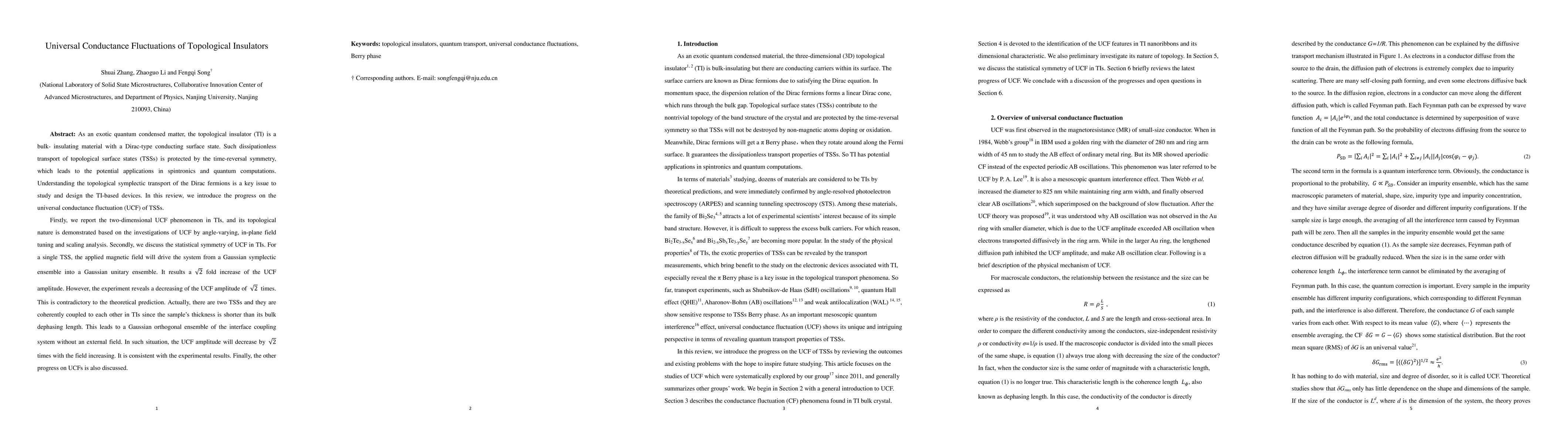 This paper reviews the universal conductance fluctuations (UCF) in topological insulators (TIs), focusing on the topological nature of two-dimensional UCF phenomena. It explains the discrepancy between theoretical predictions and experimental observations regarding UCF amplitude changes under magnetic fields, attributing it to the coherent coupling of two topological surface states in TIs.