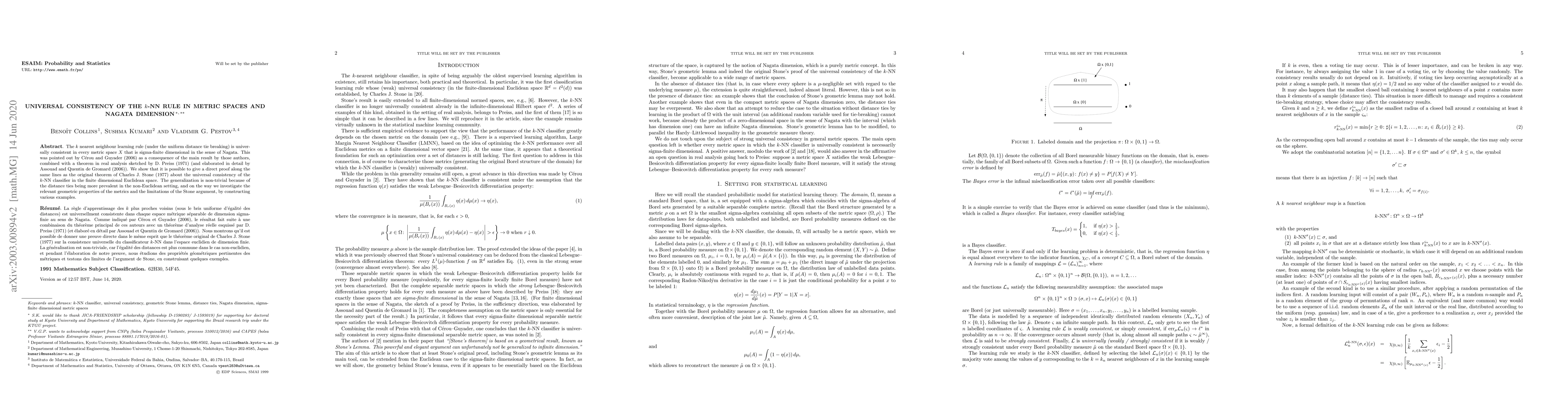 This paper demonstrates the universal consistency of the $k$-NN rule in any sigma-finite dimensional metric space under Nagata's dimension, providing a direct proof inspired by Charles J. Stone's original theorem, while addressing the complexities of distance ties in non-Euclidean settings.