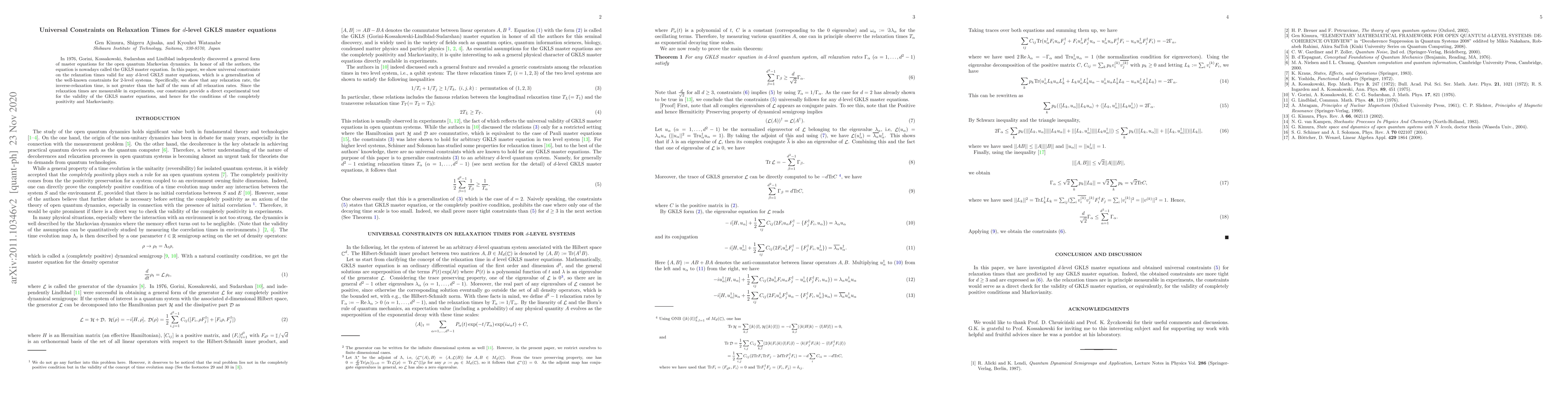 This paper establishes universal constraints on relaxation times for d-level GKLS master equations, showing that any relaxation rate cannot exceed half the sum of all rates. These constraints provide experimental tests for the validity of the GKLS master equations, confirming the conditions of complete positivity and Markovianity.