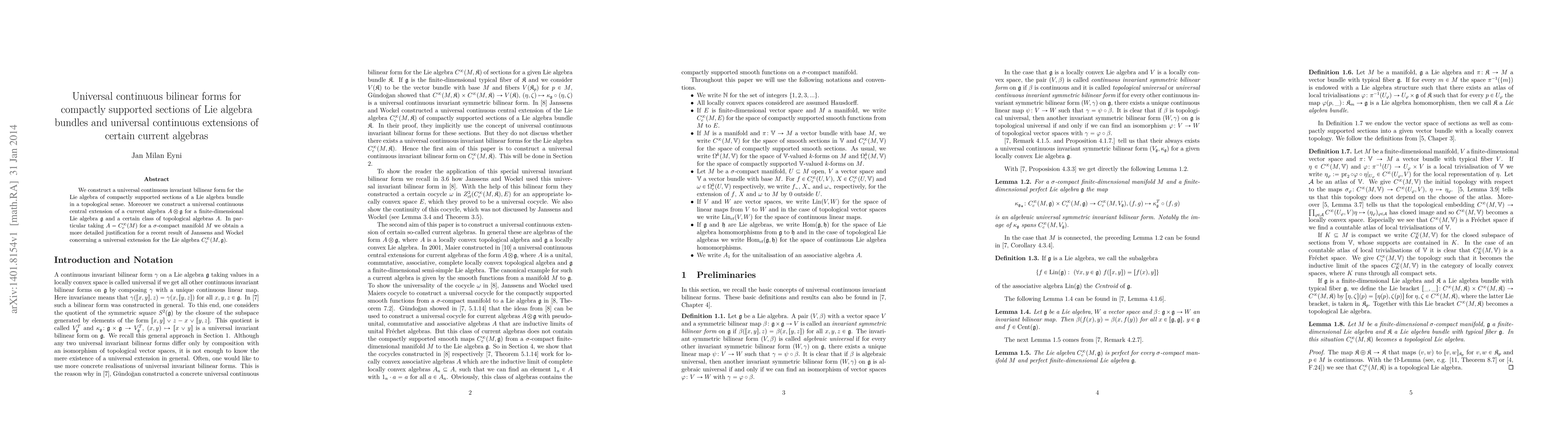 This paper constructs a universal continuous bilinear form for compactly supported sections of Lie algebra bundles and extends it to certain current algebras, providing a more detailed justification for a recent result on universal extensions.