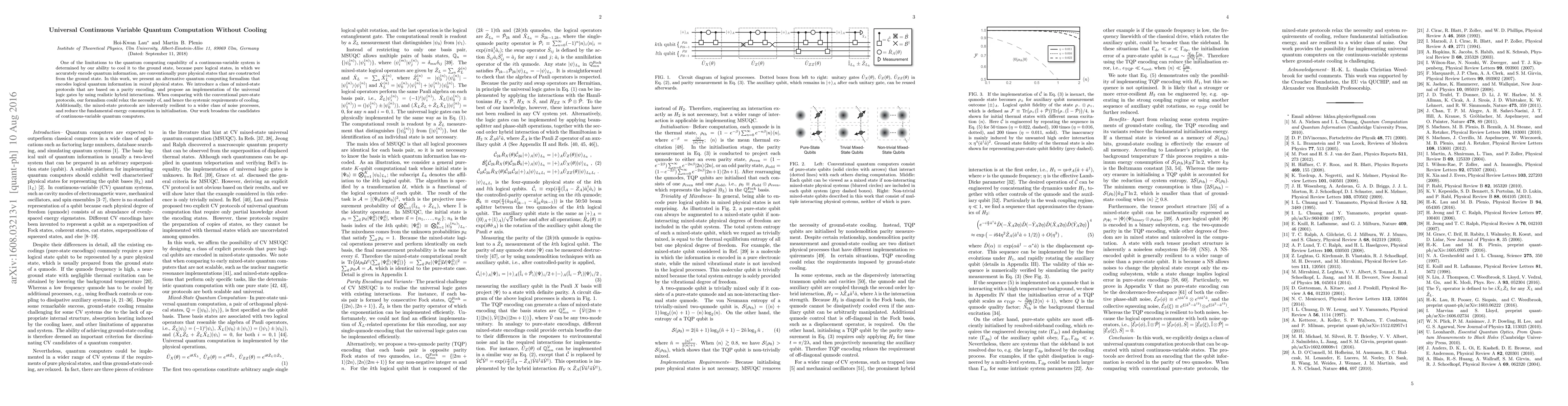 One of the limitations to the quantum computing capability of a continuous-variable system is determined by our ability to cool it to the ground state, because pure logical states, in which we accurately encode quantum information, are conventionally pure physical states that are constructed from the ground state. In this work, we present an alternative quantum computing formalism that encodes logical quantum information in mixed physical states. We introduce a class of mixed-state protocols that are based on a parity encoding, and propose an implementation of the universal logic gates by using realistic hybrid interactions. When comparing with the conventional pure-state protocols, our formalism could relax the necessity of, and hence the systemic requirements of cooling. Additionally, the mixed-state protocols are inherently resilient to a wider class of noise processes, and reduce the fundamental energy consumption in initialisation. Our work broadens the candidates of continuous-variable quantum computers.