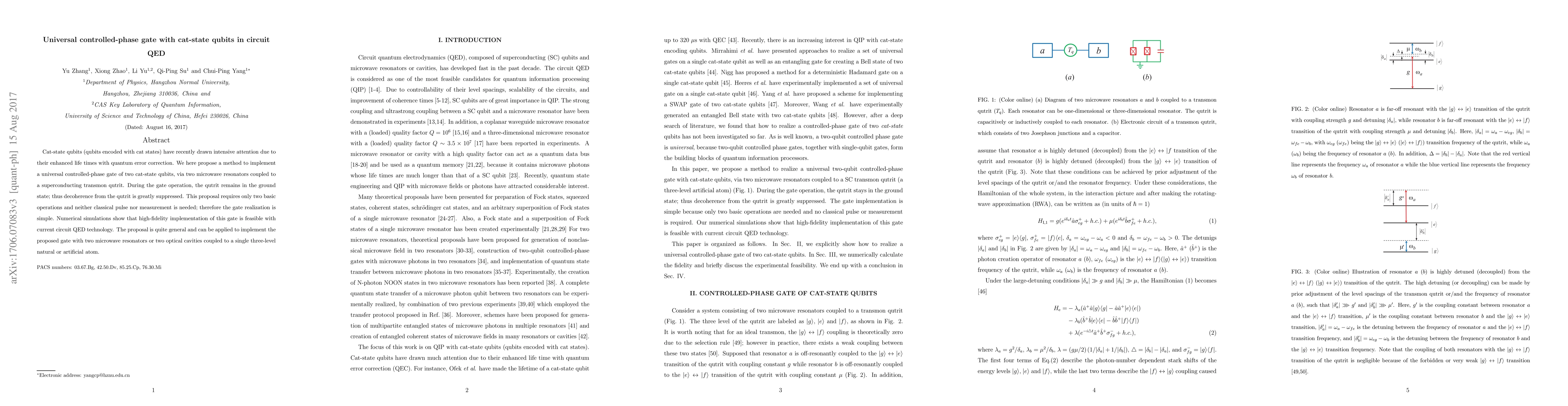 This paper proposes a universal controlled-phase gate for cat-state qubits using circuit QED, employing a superconducting transmon qutrit coupled to two microwave resonators. The gate operation suppresses decoherence and requires only two basic operations without classical pulses or measurements, demonstrating high-fidelity implementation feasibility with current technology.