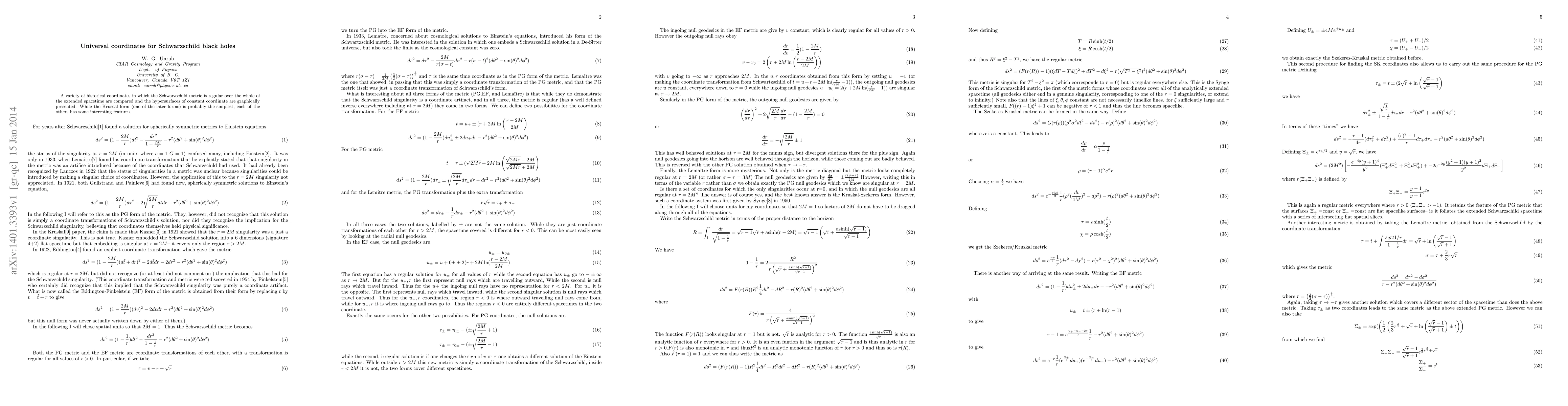 A variety of historical coordinates in which the Schwarzschild metric is regular over the whole of the extended spacetime are compared and the hypersurfaces of constant coordinate are graphically presented. While the Kruscal form (one of the later forms) is probably the simplest, each of the others has some interesting features.