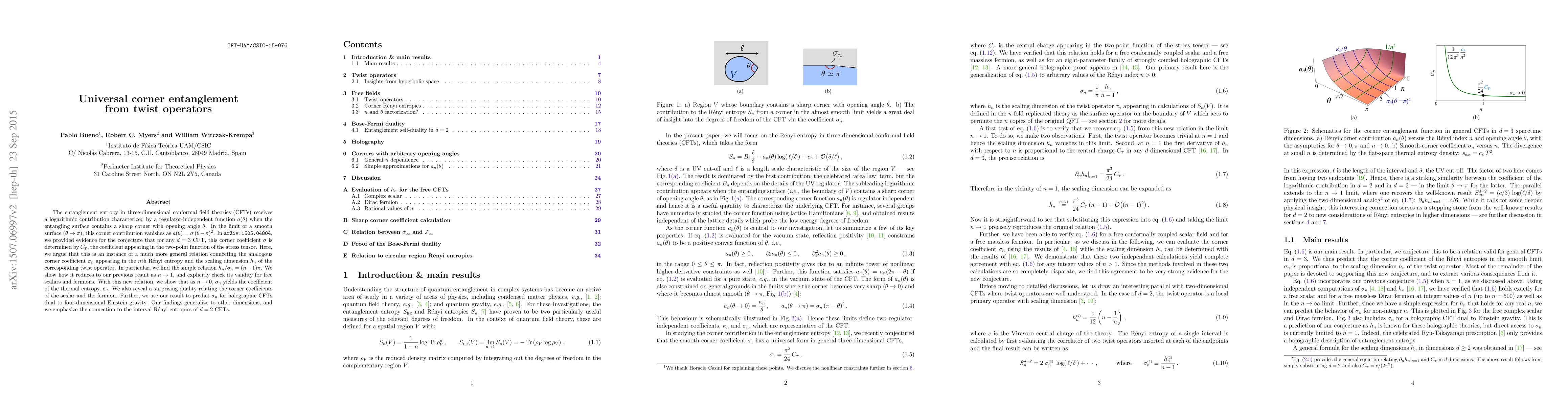 The entanglement entropy in three-dimensional conformal field theories (CFTs) receives a logarithmic contribution characterized by a regulator-independent function $a(\theta)$ when the entangling surface contains a sharp corner with opening angle $\theta$. In the limit of a smooth surface ($\theta\rightarrow\pi$), this corner contribution vanishes as $a(\theta)=\sigma\,(\theta-\pi)^2$. In arXiv:1505.04804, we provided evidence for the conjecture that for any $d=3$ CFT, this corner coefficient $\sigma$ is determined by $C_T$, the coefficient appearing in the two-point function of the stress tensor. Here, we argue that this is a particular instance of a much more general relation connecting the analogous corner coefficient $\sigma_n$ appearing in the $n$th R\'enyi entropy and the scaling dimension $h_n$ of the corresponding twist operator. In particular, we find the simple relation $h_n/\sigma_n=(n-1)\pi$. We show how it reduces to our previous result as $n\rightarrow 1$, and explicitly check its validity for free scalars and fermions. With this new relation, we show that as $n\rightarrow 0$, $\sigma_n$ yields the coefficient of the thermal entropy, $c_S$. We also reveal a surprising duality relating the corner coefficients of the scalar and the fermion. Further, we use our result to predict $\sigma_n$ for holographic CFTs dual to four-dimensional Einstein gravity. Our findings generalize to other dimensions, and we emphasize the connection to the interval R\'enyi entropies of $d=2$ CFTs.